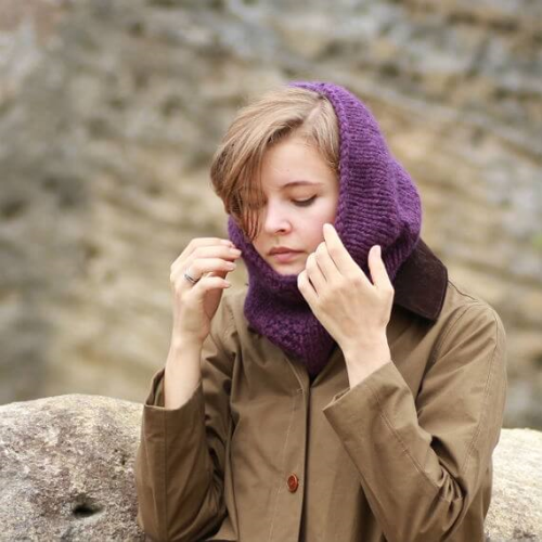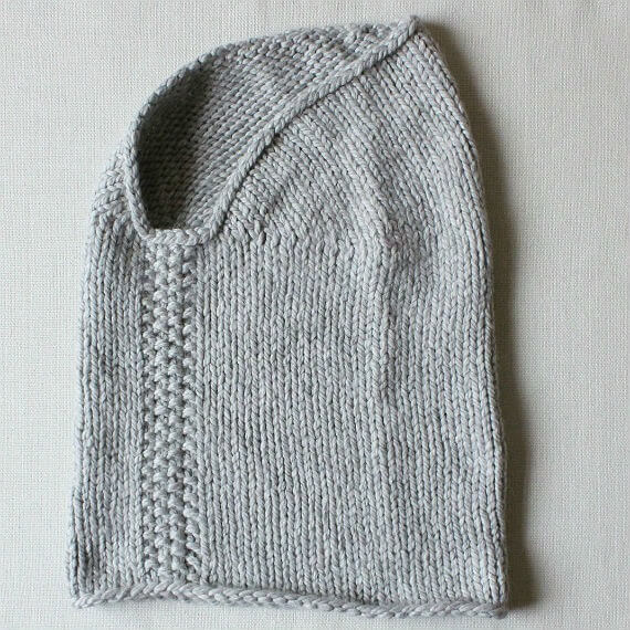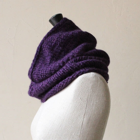 頭まですっぽりおおう、バルキーな糸で編むカウル。