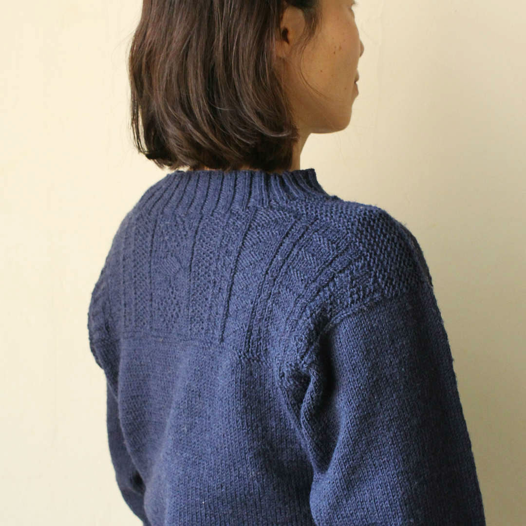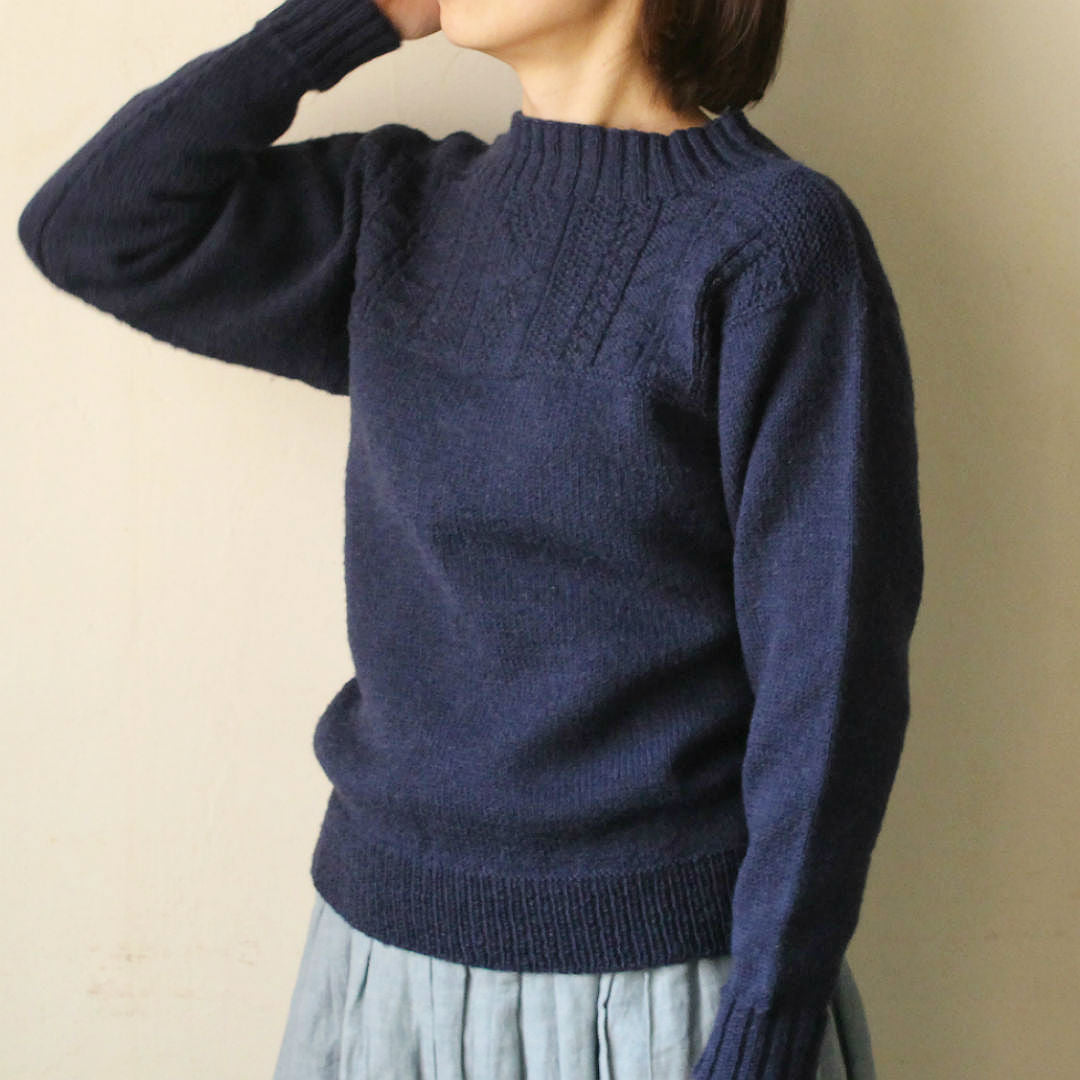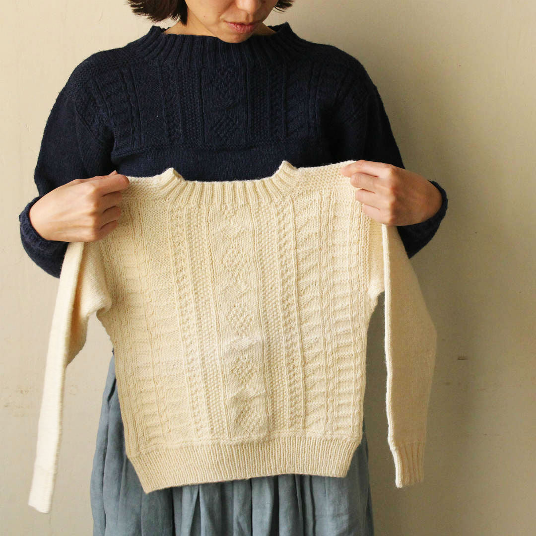 輪で筒状に編み進め、身頃サイドにシームステッチを入れたり、脇下にマチをつくるなど、伝統的な編み方に則って完成するセーター。