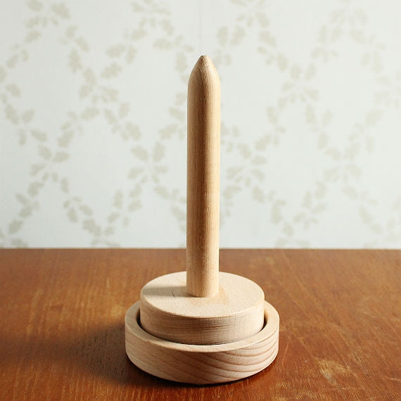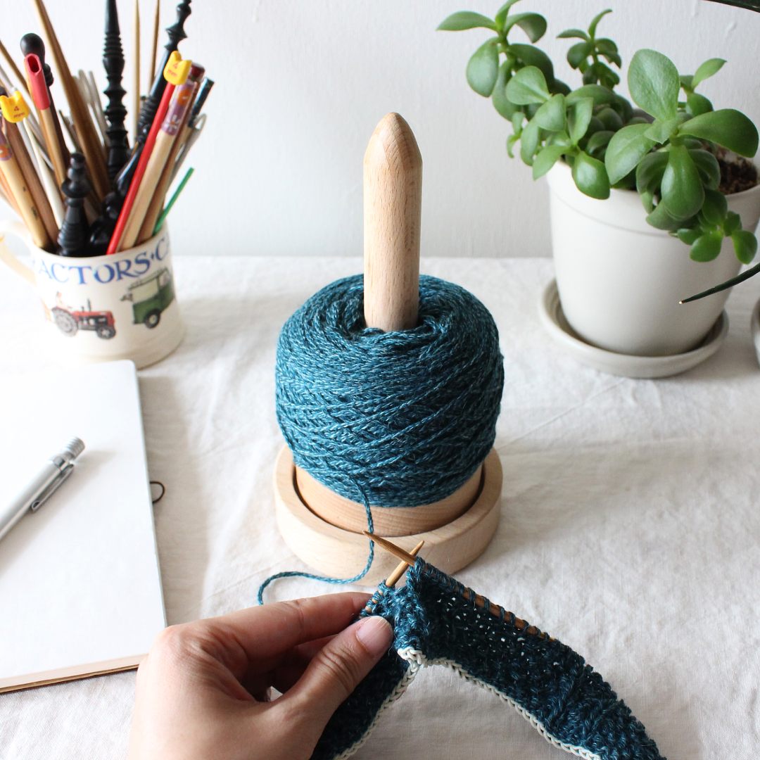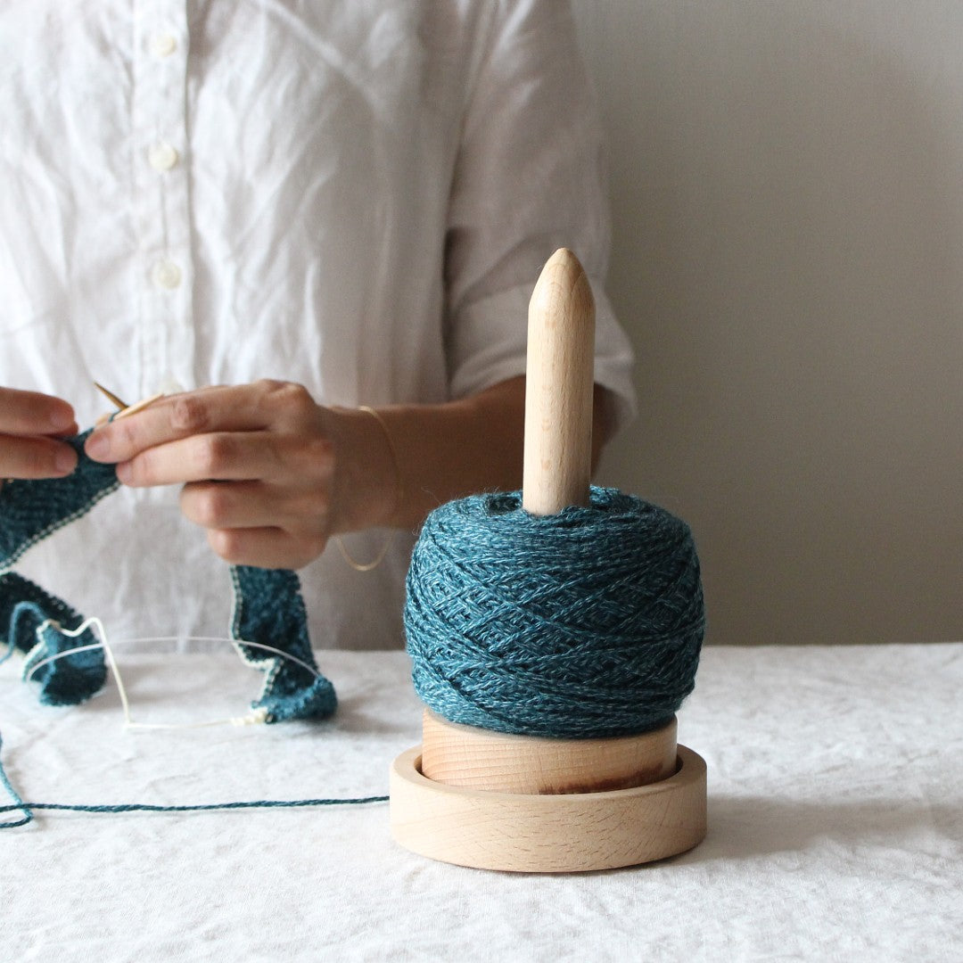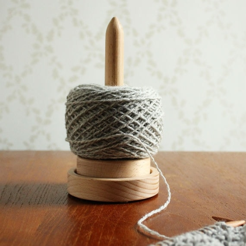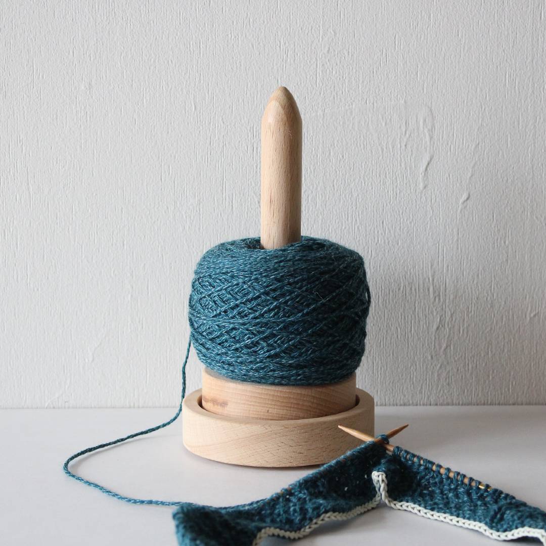 支柱に毛糸玉を差し込んで編めば、毛糸が転がって汚れたり絡まらずストレスフリー。