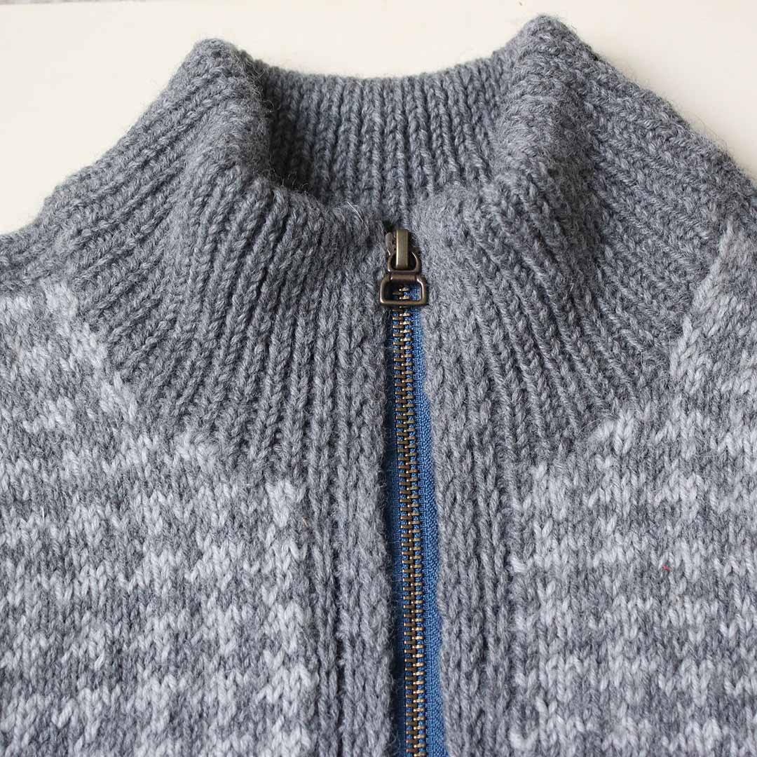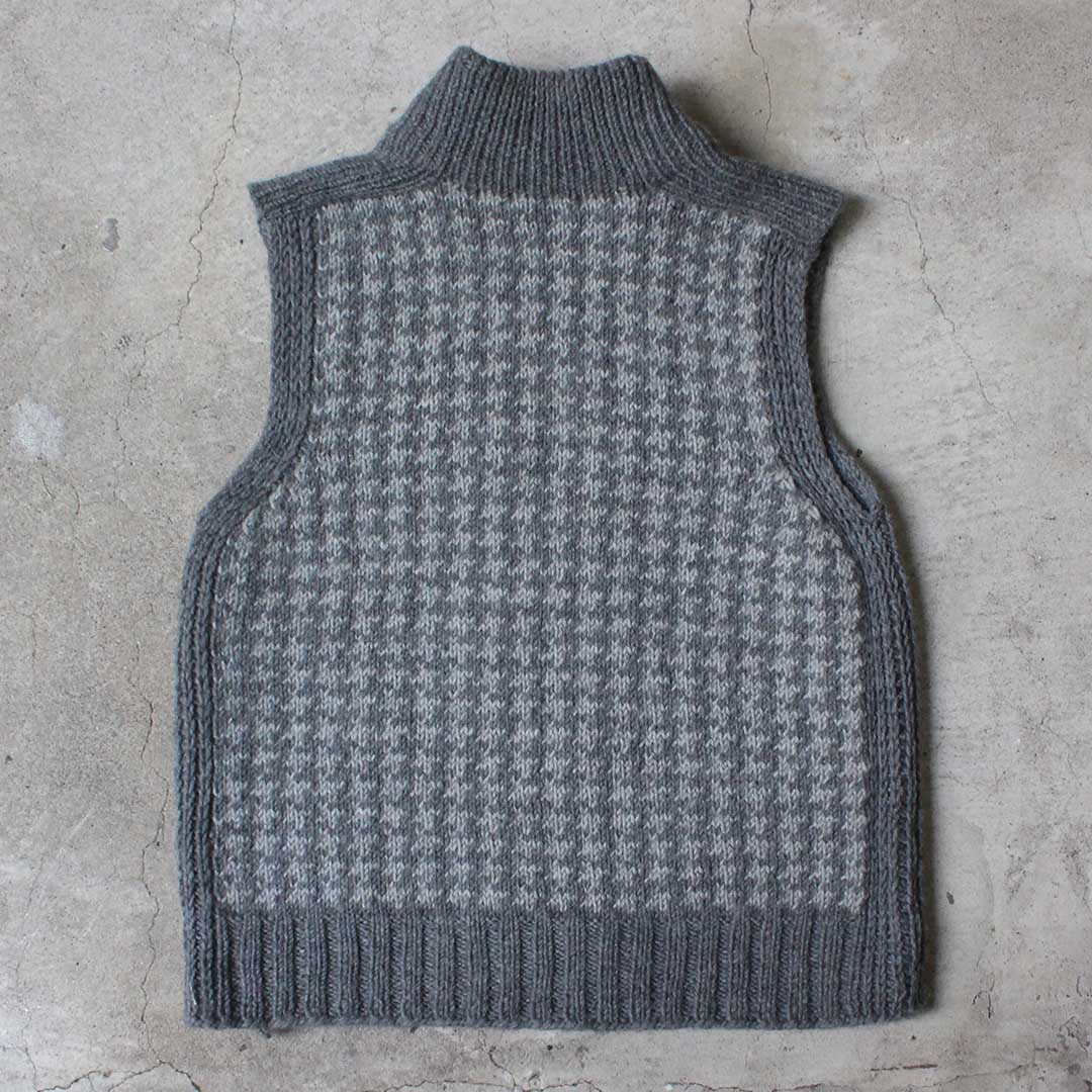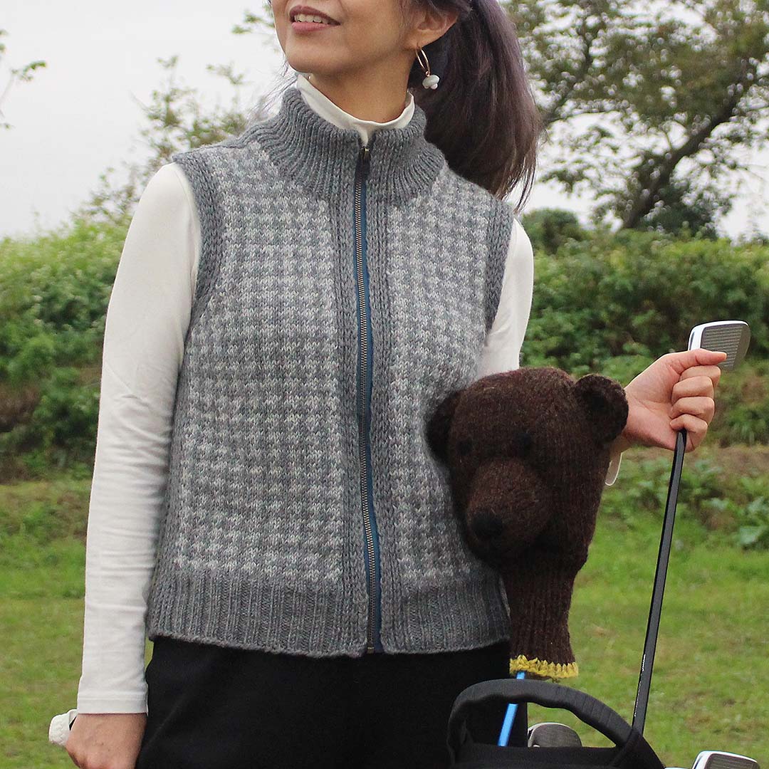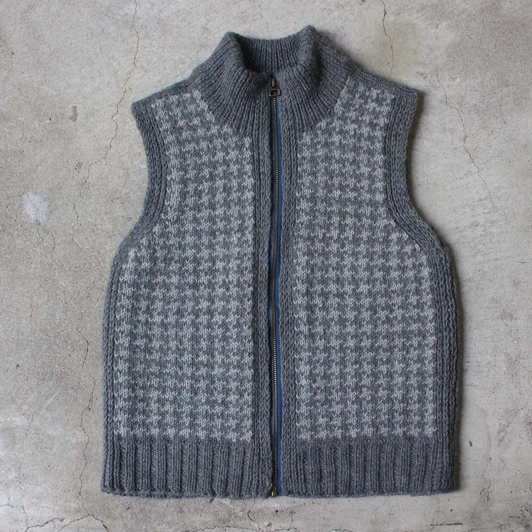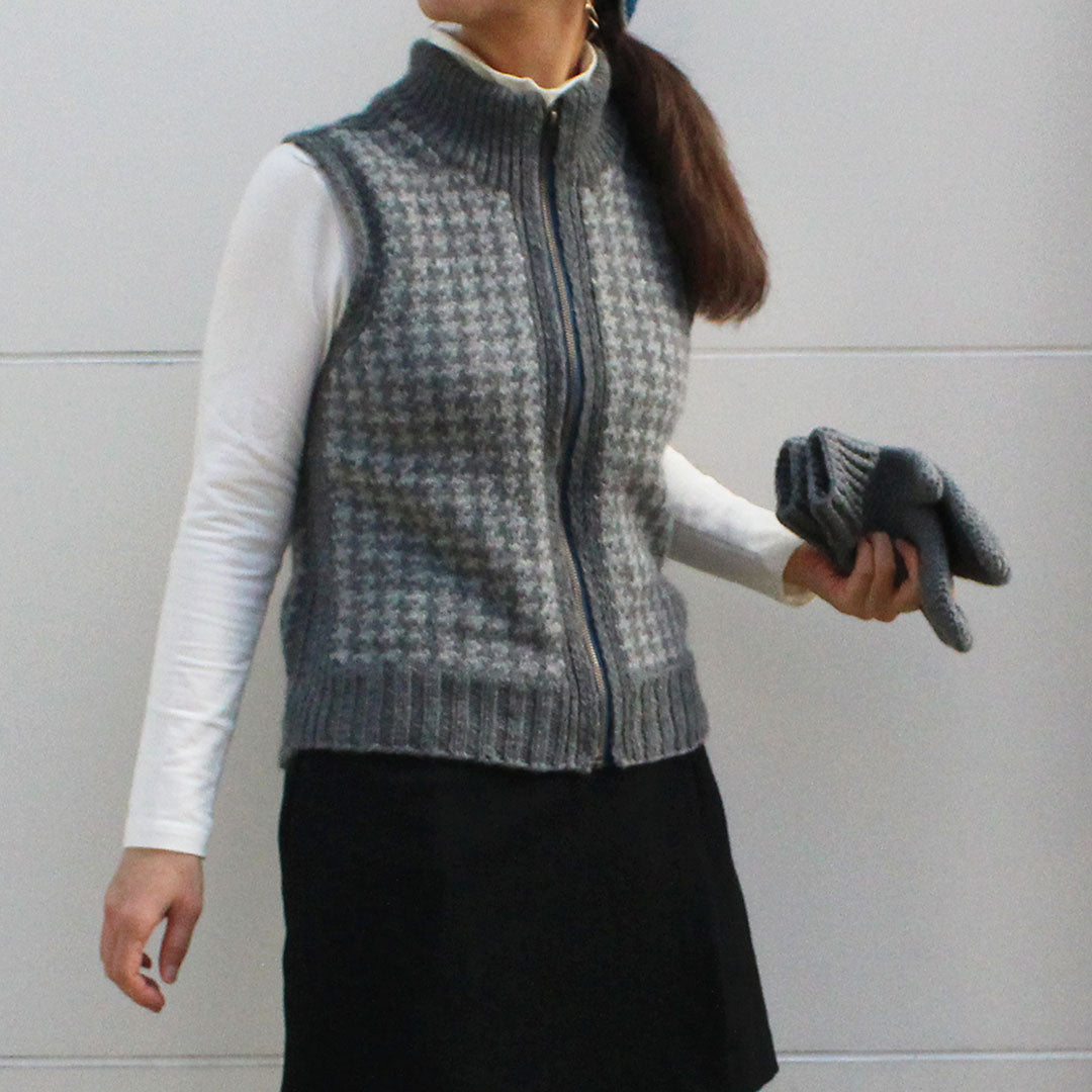 クラシックな幾何学模様を、無地の引き上げゴム編みで囲ったようなデザインのジップアップベストです。