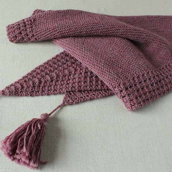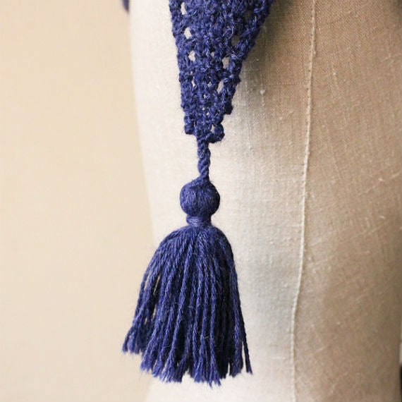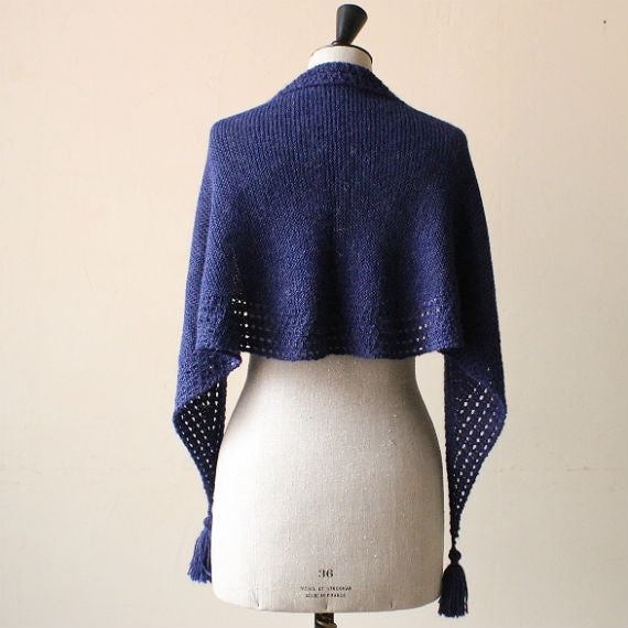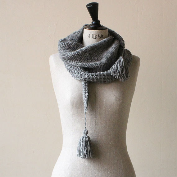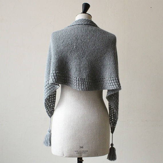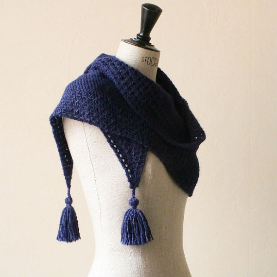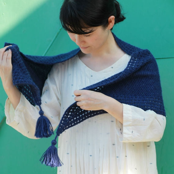 少ない目数から目を増やし、最後は目を減らしていくパターン。周囲のふちに入る透かし模様が身に着けた時のアクセントに。アルパカのしっとり感とガーター編みとのマッチングで、やわらかく肩に沿う使いやすいショールは、タッセルづくりも楽しい一枚。