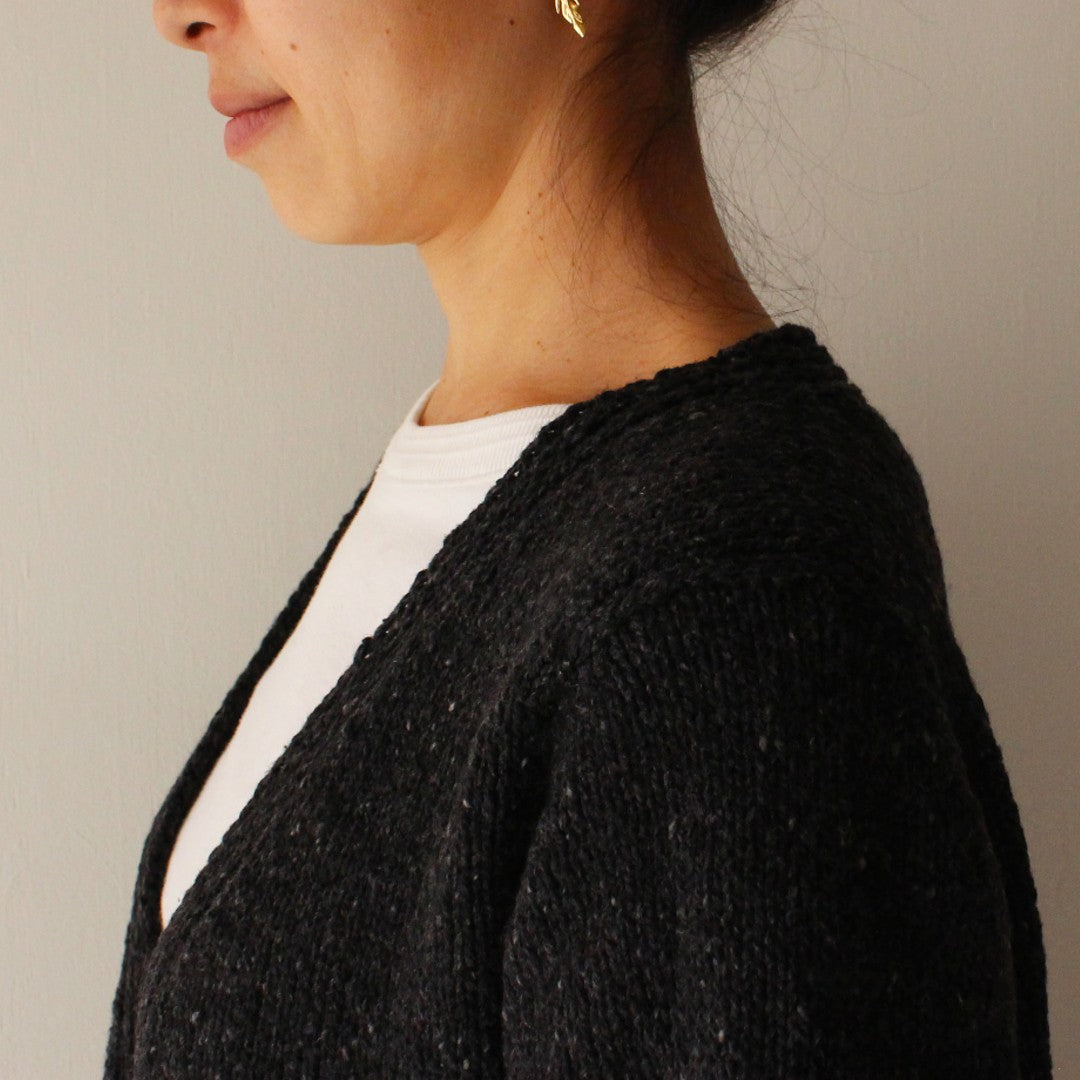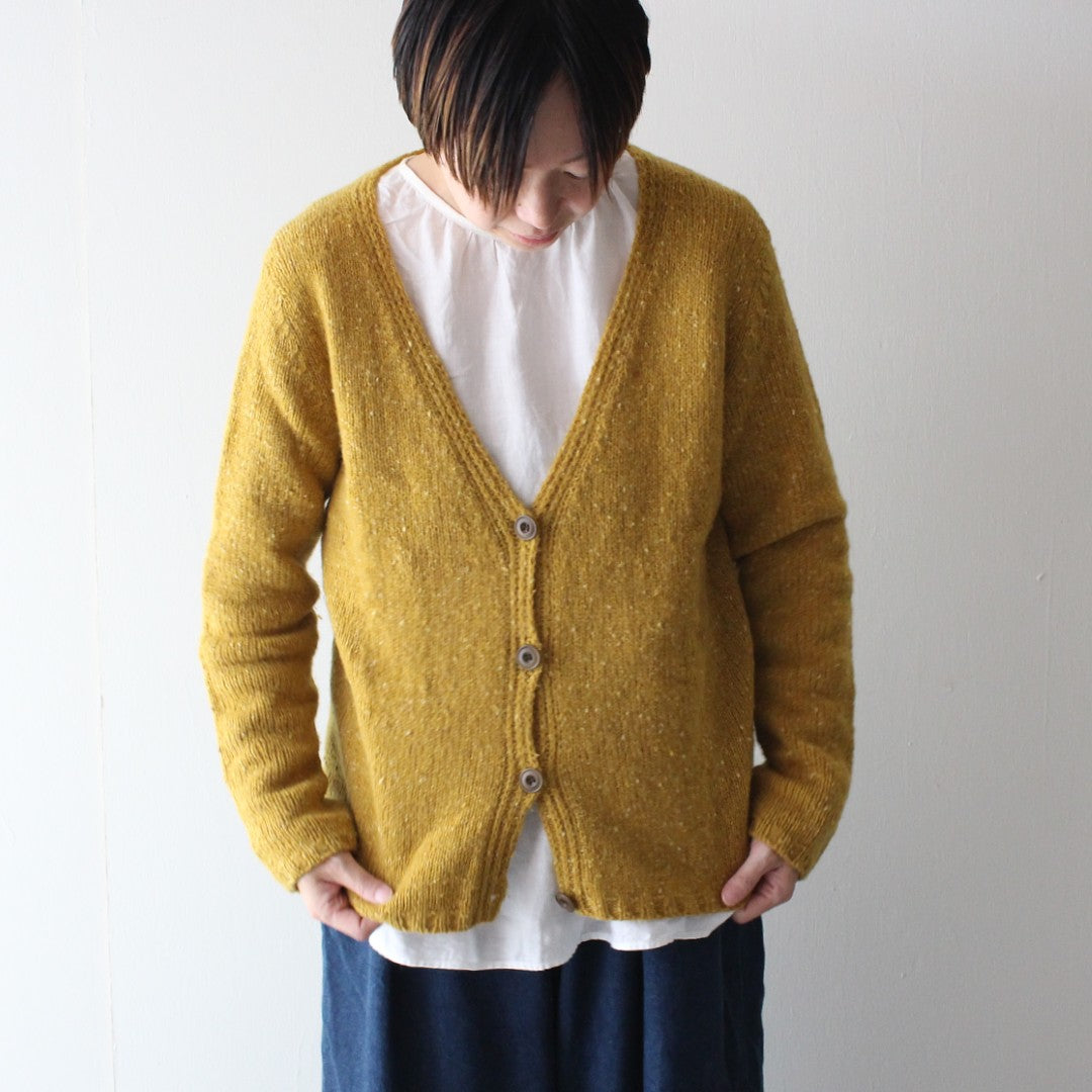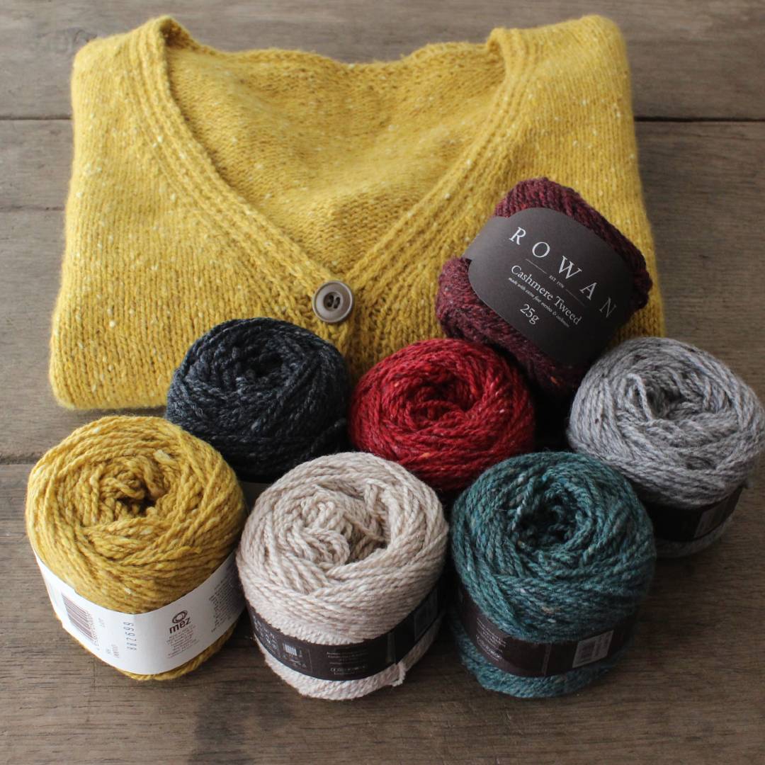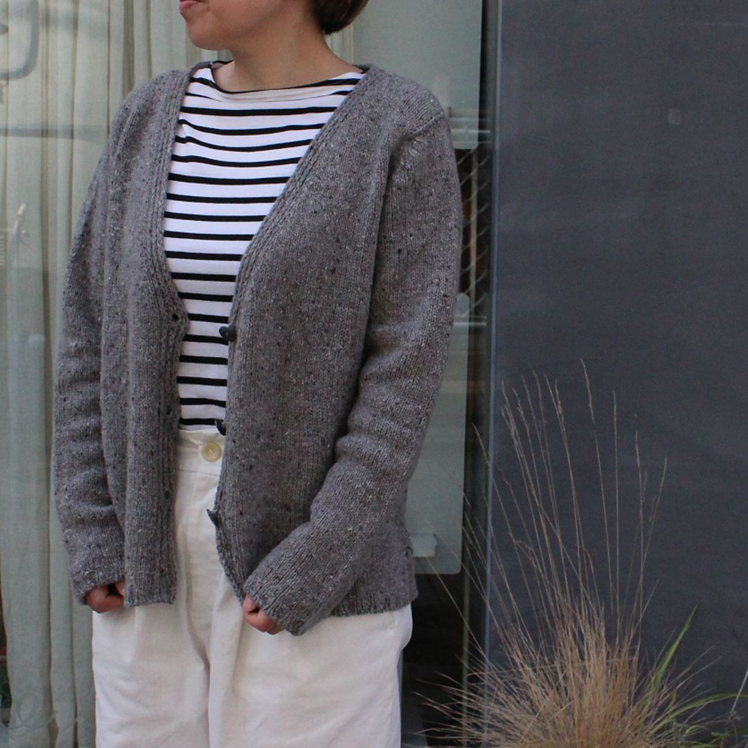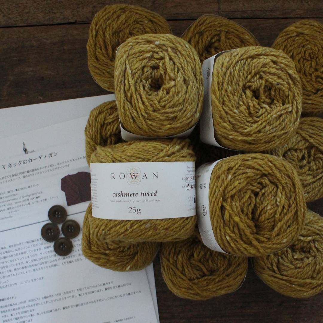 メリノウールとカシミアをブレンドしたROWAN「カシミアツイード」で編む、Vネックカーディガンのキットです。