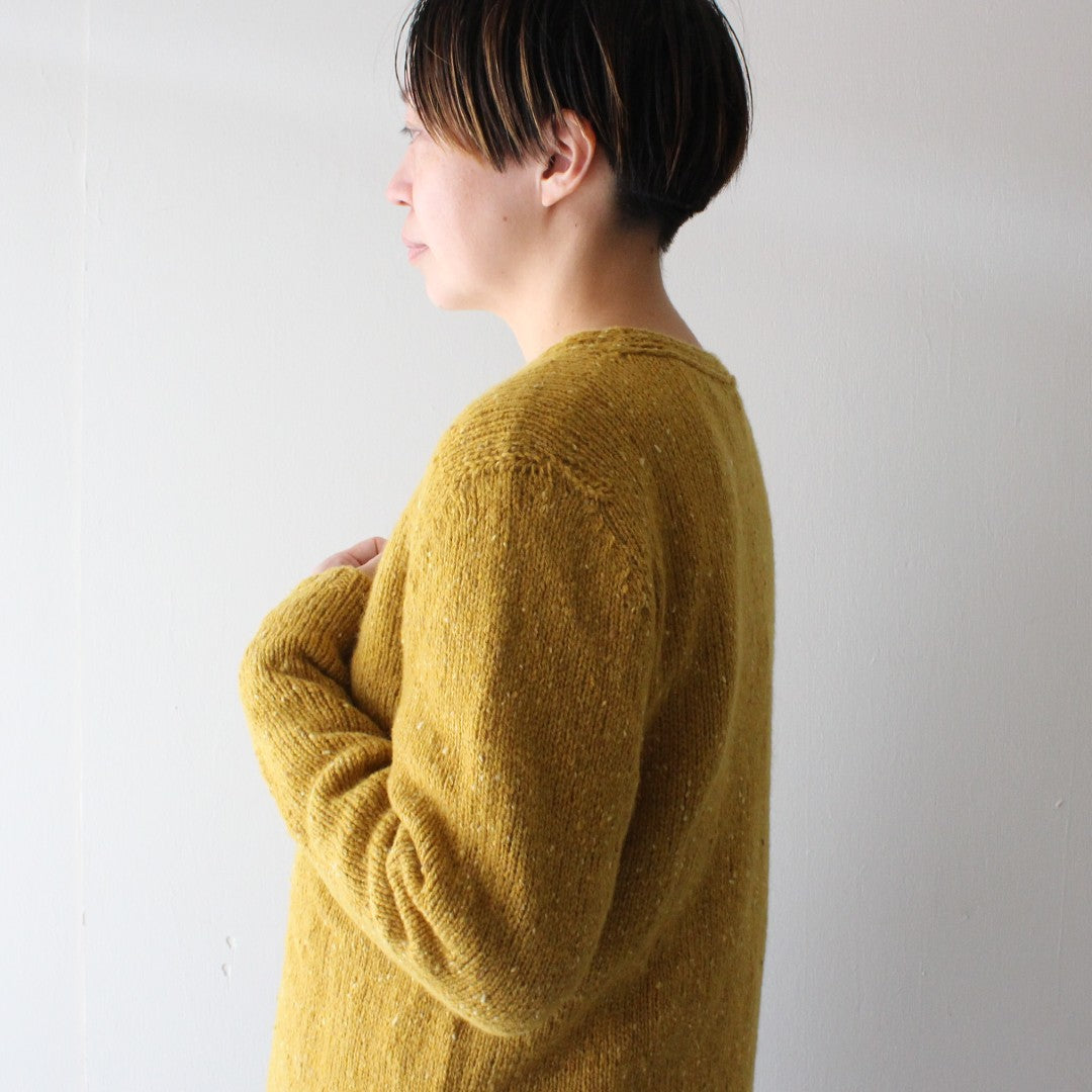 ネップの入ったクラシカルな雰囲気の糸が活きる、ボックスシルエット・すっきりとしたセットインスリーブ・深めのVネックが特徴の、着こなしやすいデザインです。