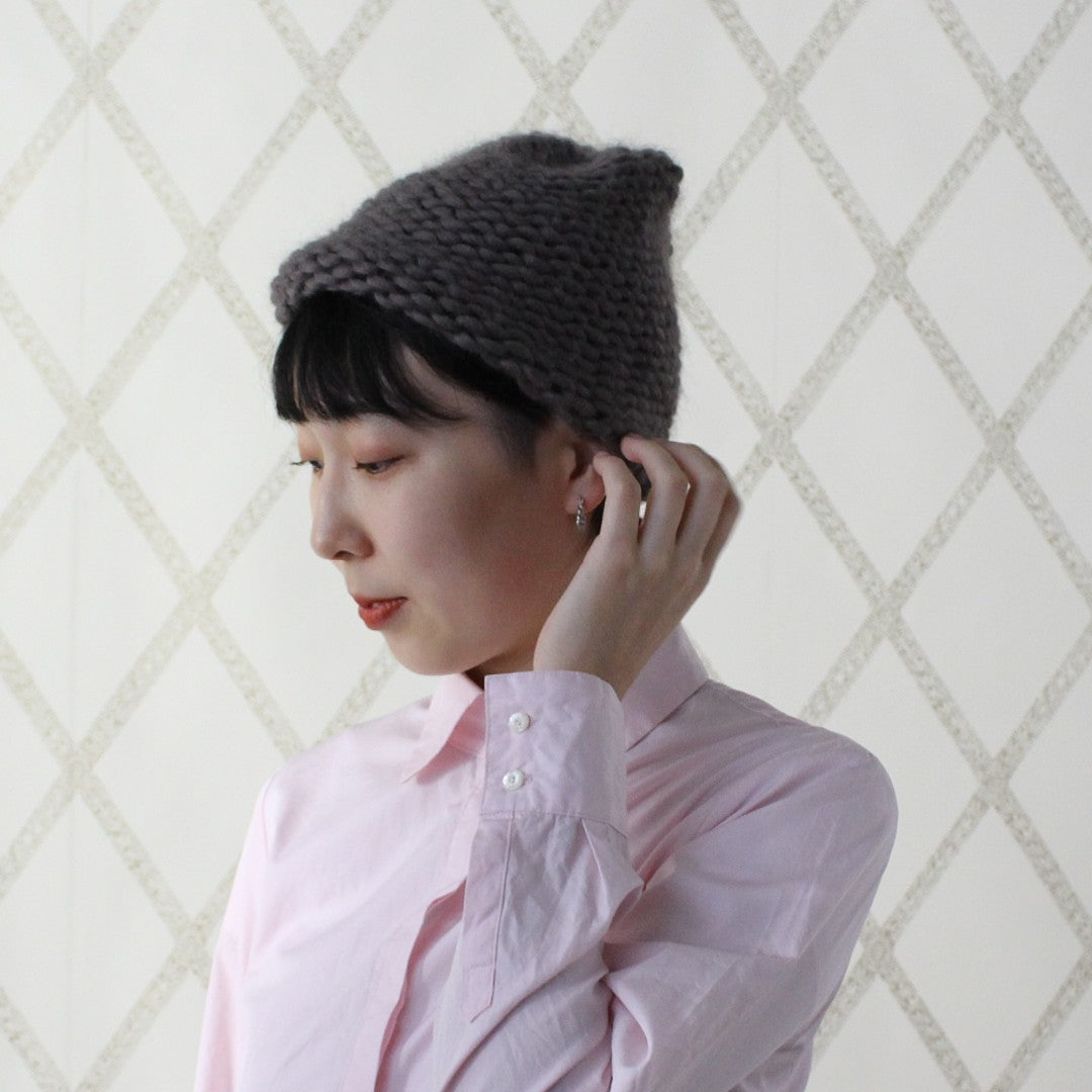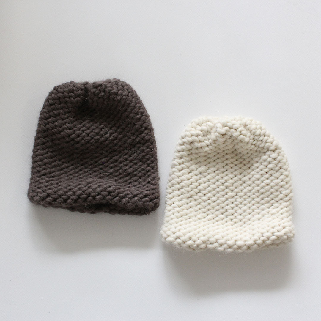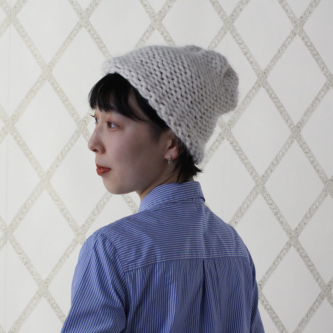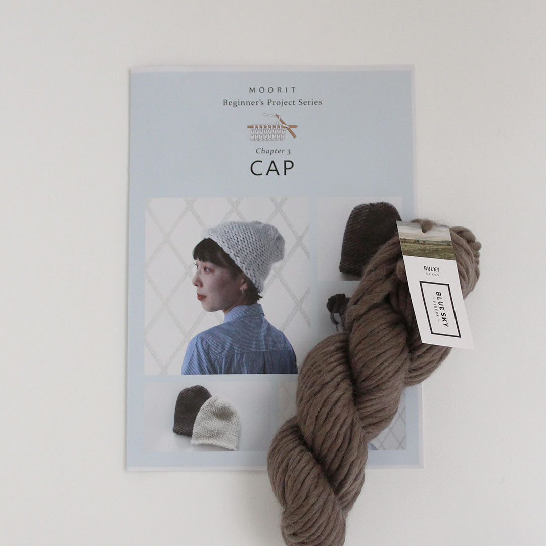 Chapter3は、輪に編むキャップのキットです。輪針を使って、編み地の表側の面を見てぐるぐると編んでいきます。タイトルにある「パール」とはパールステッチ、裏目のことで、編みあがったら表裏をひっくり返して裏目の丸い編み目を見せて仕上げましょう。糸は、ふっくらと気持ちのいいアルパカ&ウールの「Bulky」。輪編みをマスターしたら、手袋やソックスなど編めるものがぐんと増えますよ。