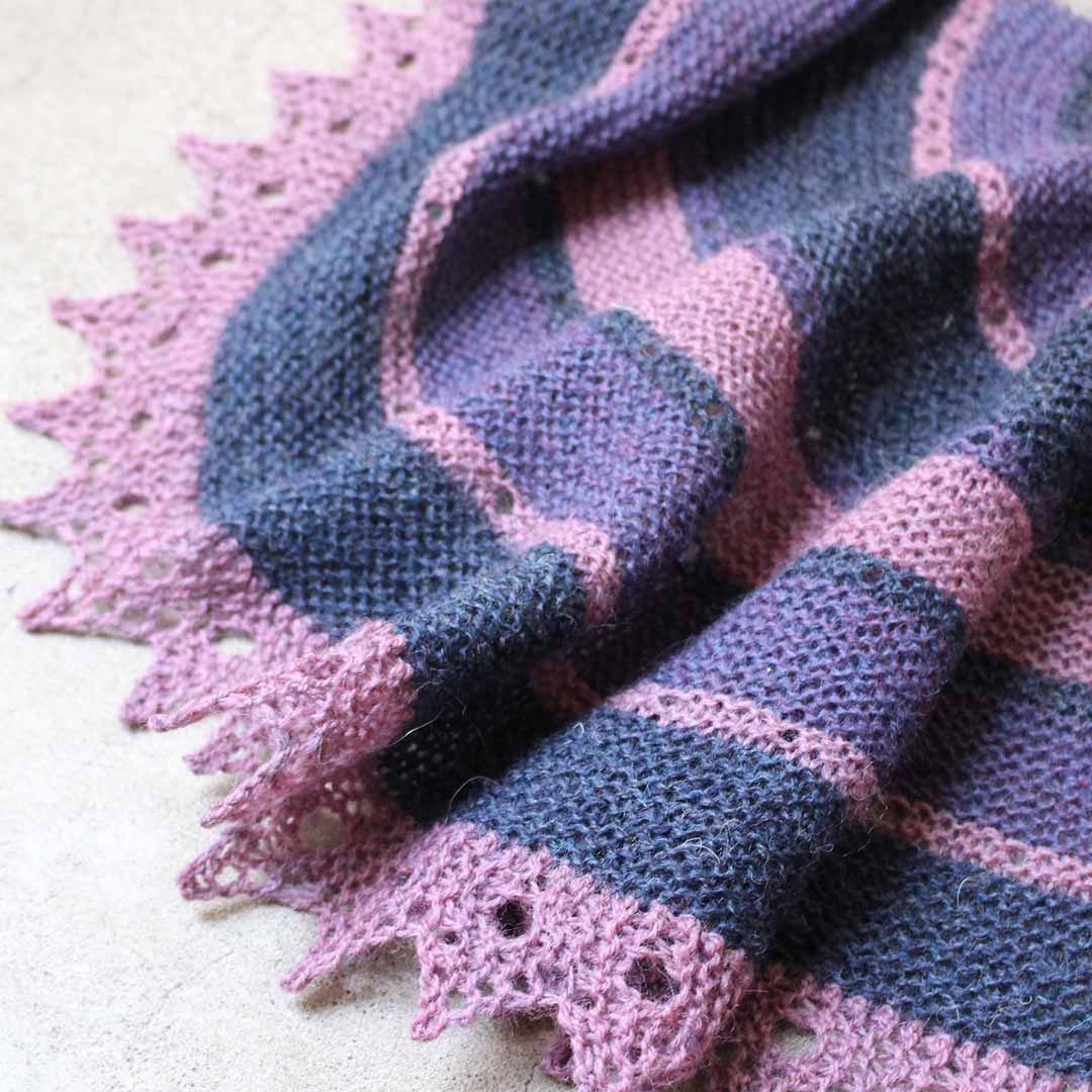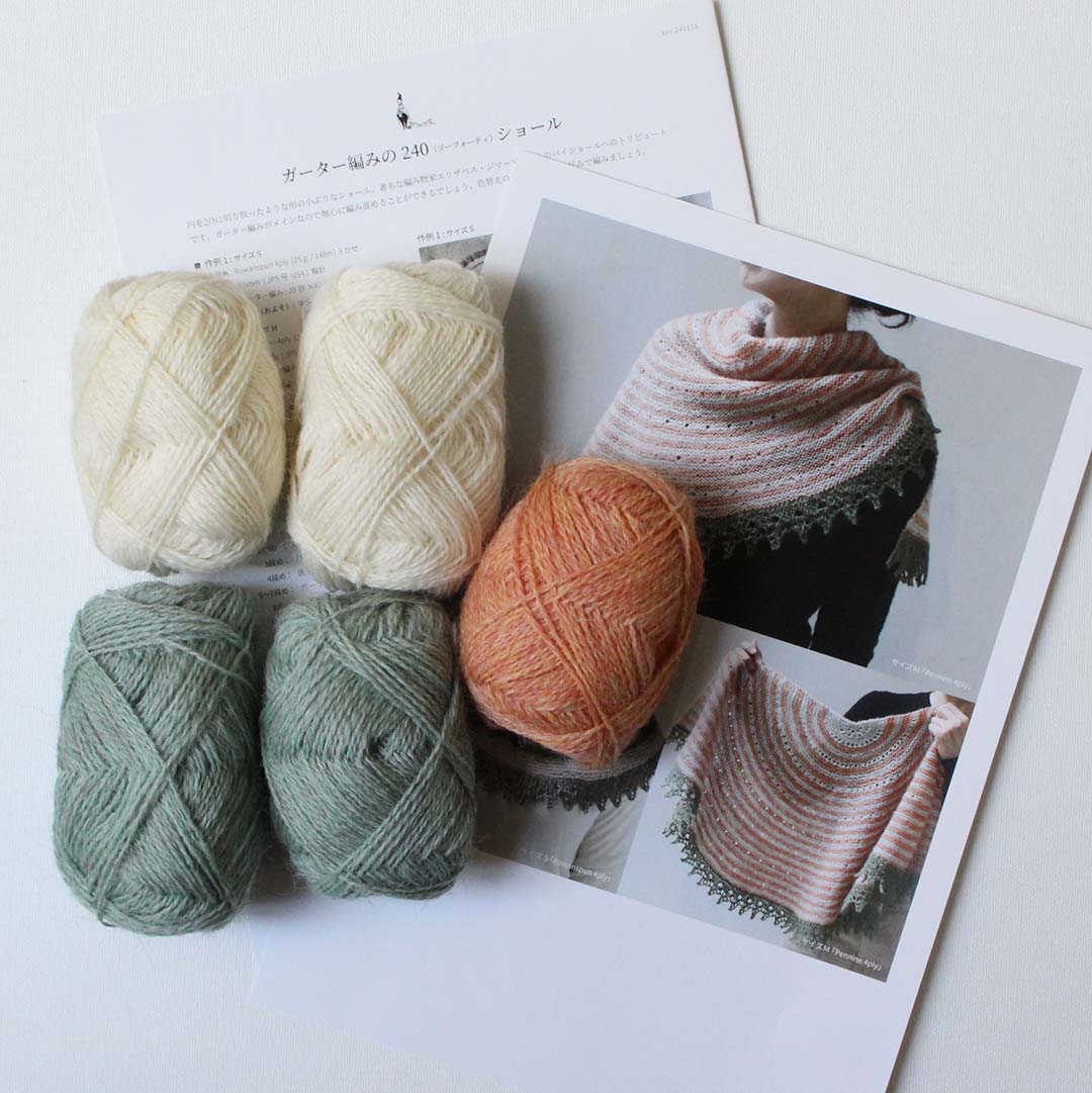 先にリリースした「Rowanspun 4ply」と同じデザインですが、大きめサイズ(Mサイズ)の240ショールをブリティッシュウール「PENNINE」で編むキットをつくりました。