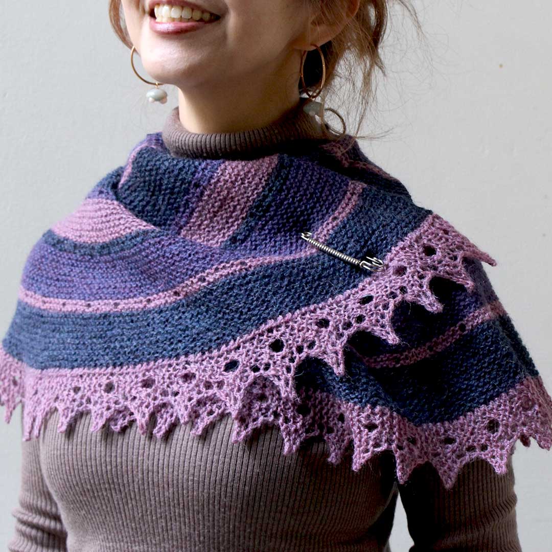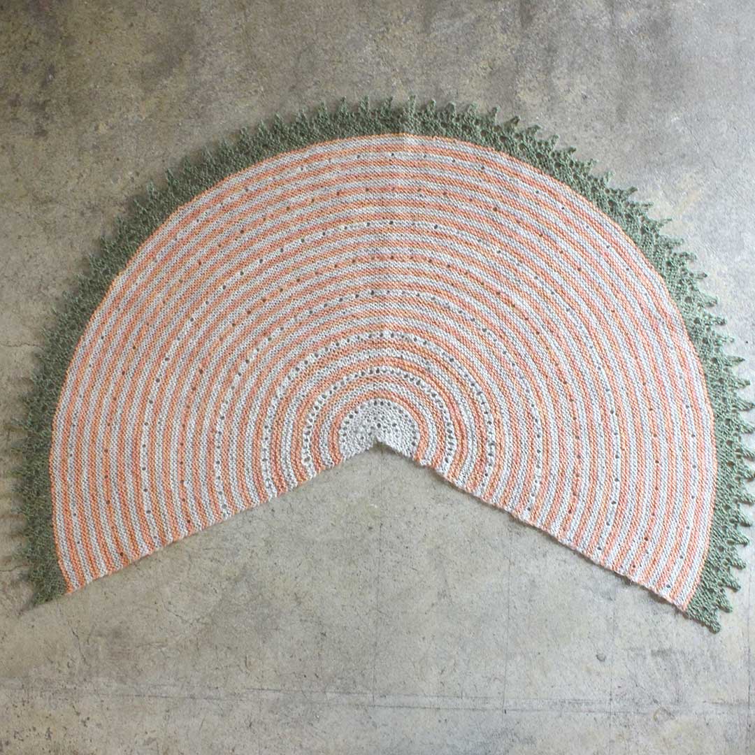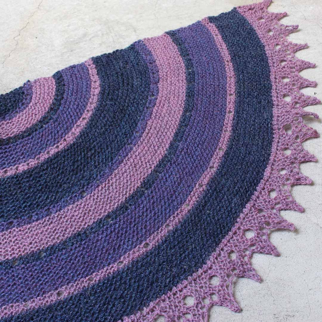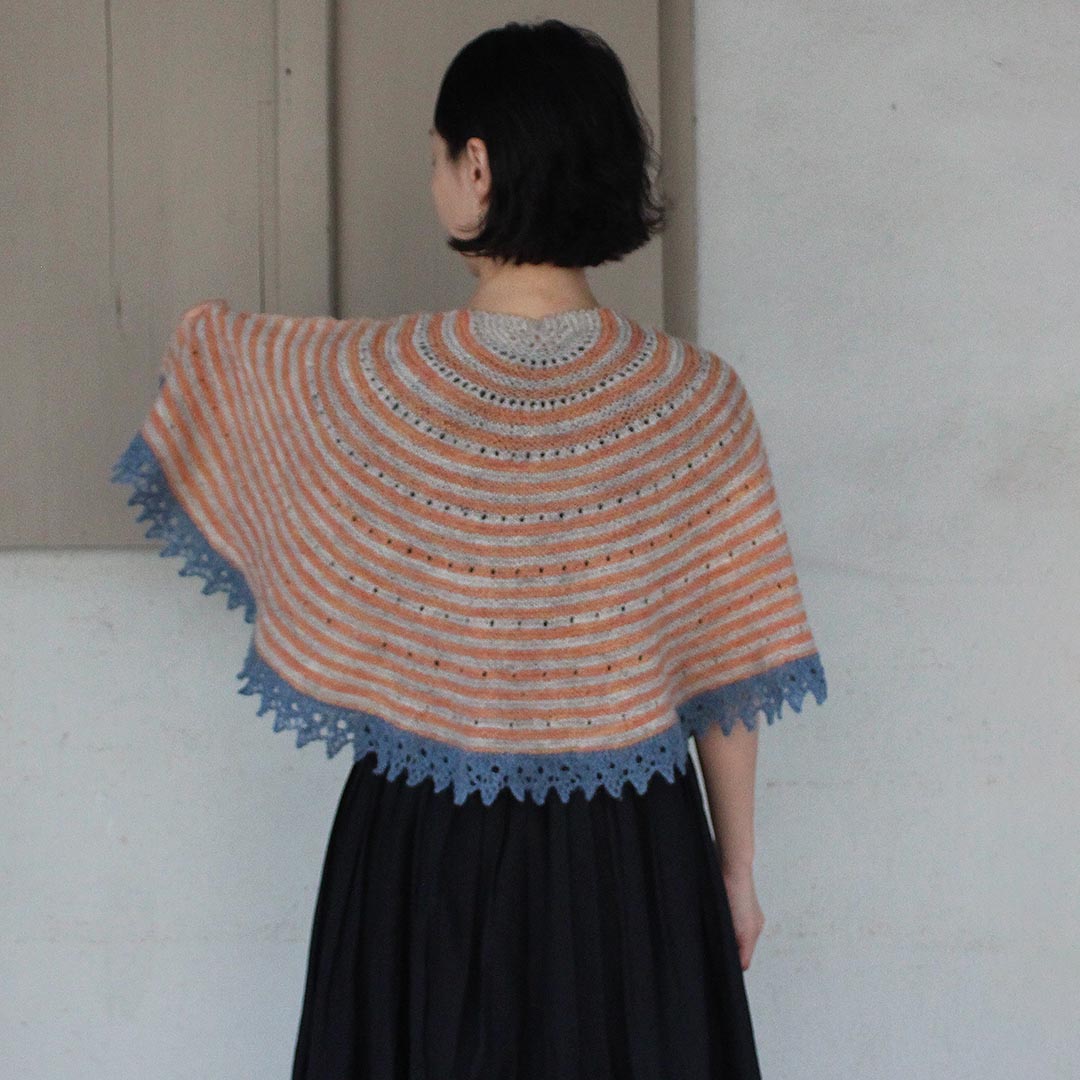 円を2/3に切り取ったような形の240(ツーフォーティ)ショールは、著名な編み物家である Elizabeth Zimmerman(エリザベス・ジマーマン)さんの円形ショール「PI Shawl」へのトリビュート。