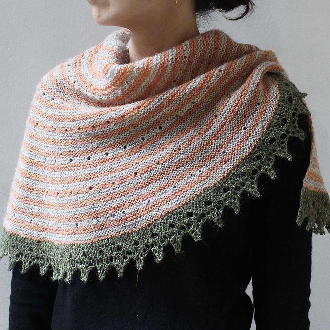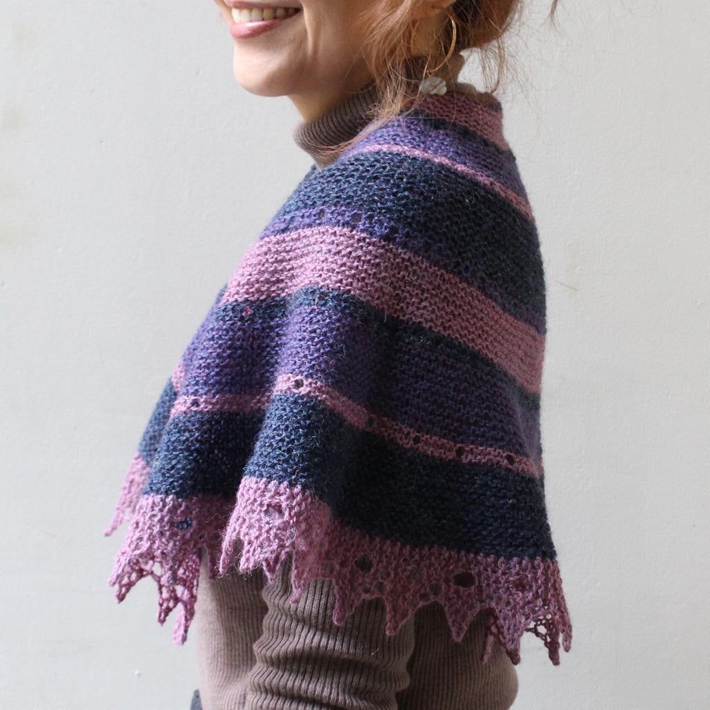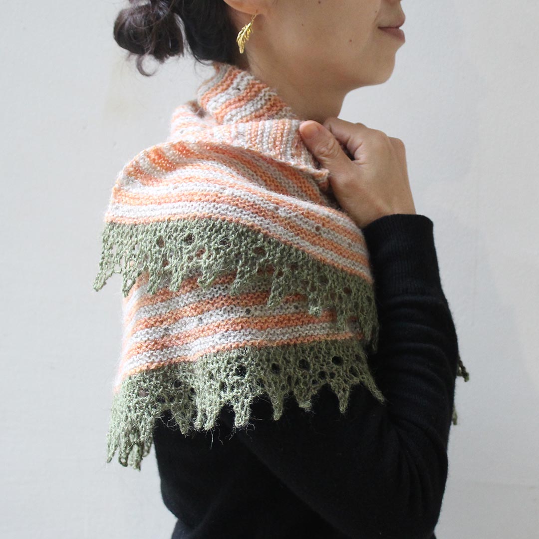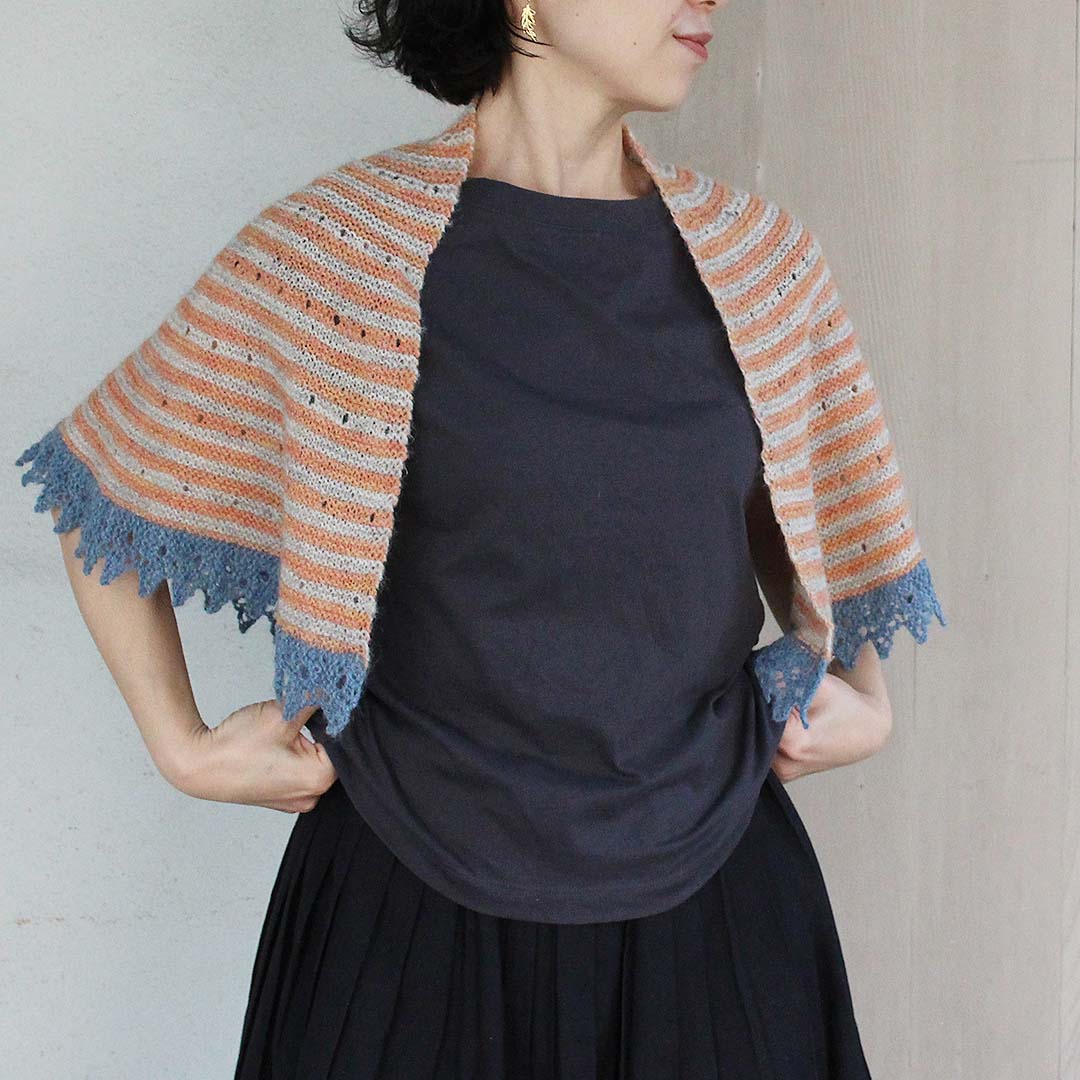 円を2/3に切り取ったような形の240(ツーフォーティ)ショールは、著名な編み物家である Elizabeth Zimmerman(エリザベス・ジマーマン)さんの円形ショール「PI Shawl」へのトリビュート。