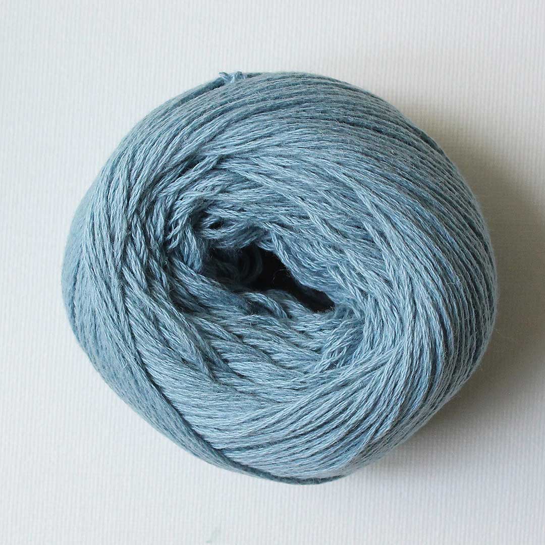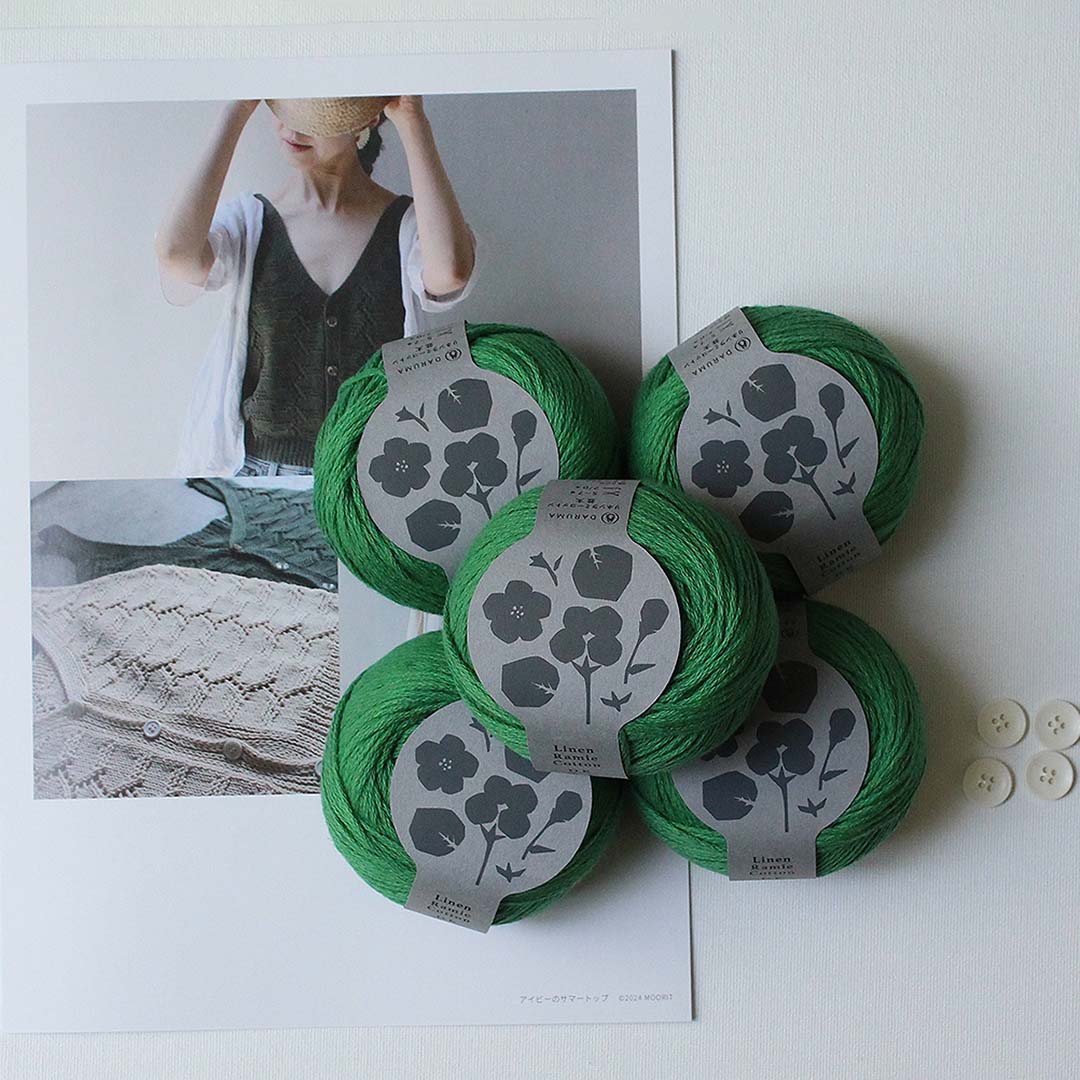 柔らかなコットンと、清涼感のある麻素材をブレンドした春夏向きの手編み糸で、独特のシャリ感が気持ちのよい編地に仕上がります。