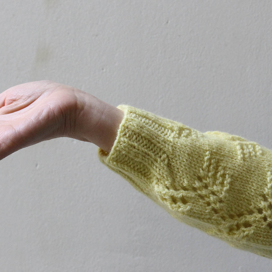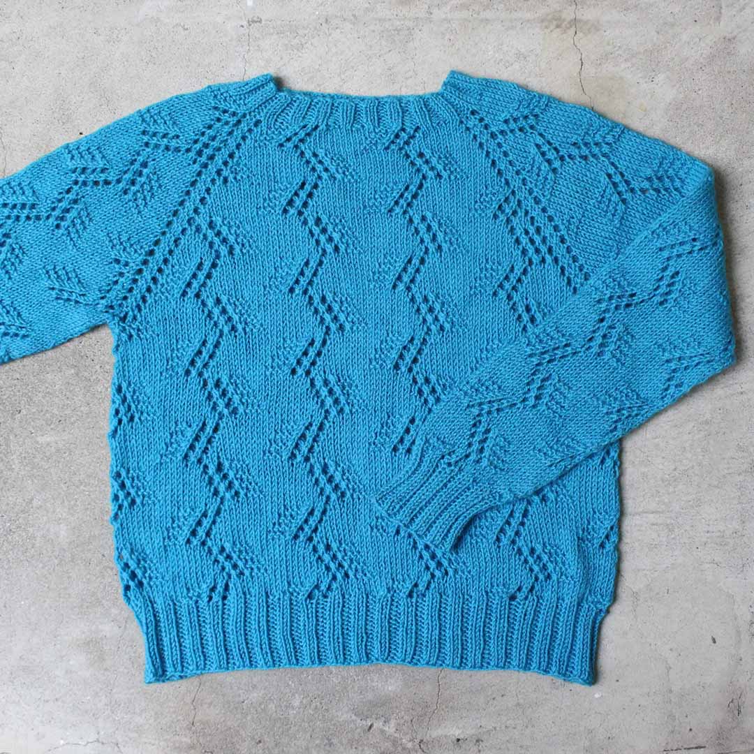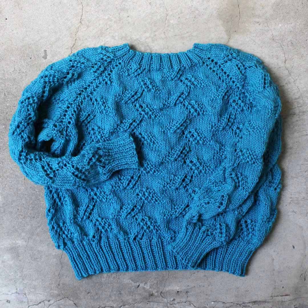 編みやすい太さ(DK)のメリノウール糸を使って、トップダウンに輪で編み進めていくプルオーバー。