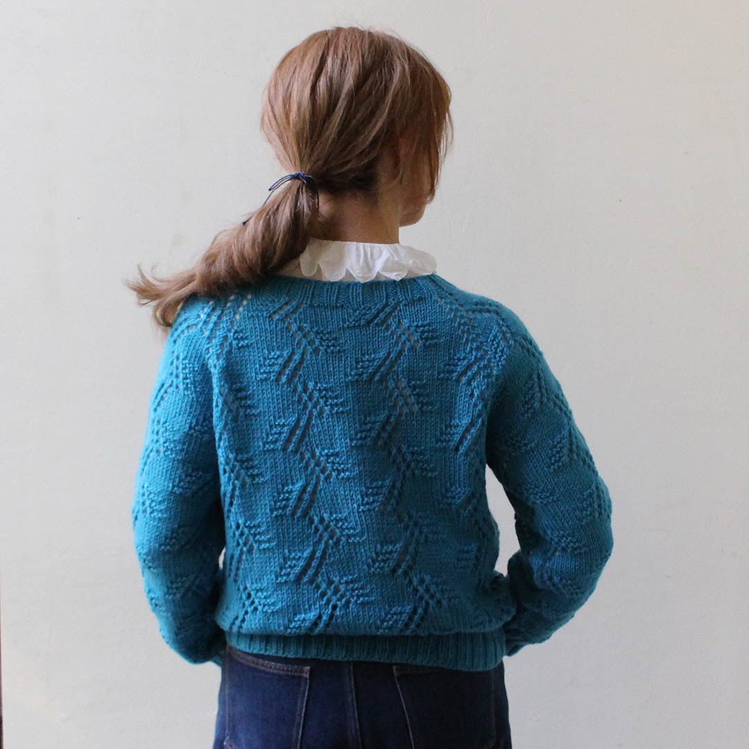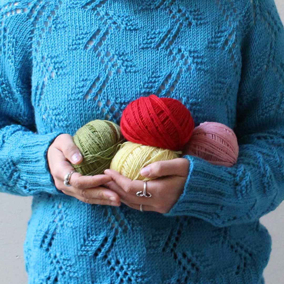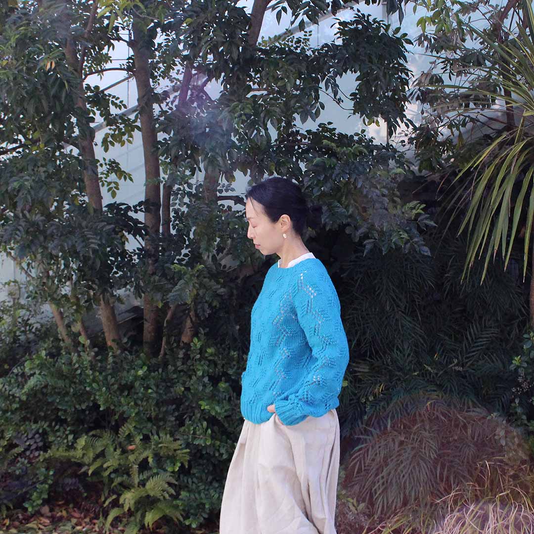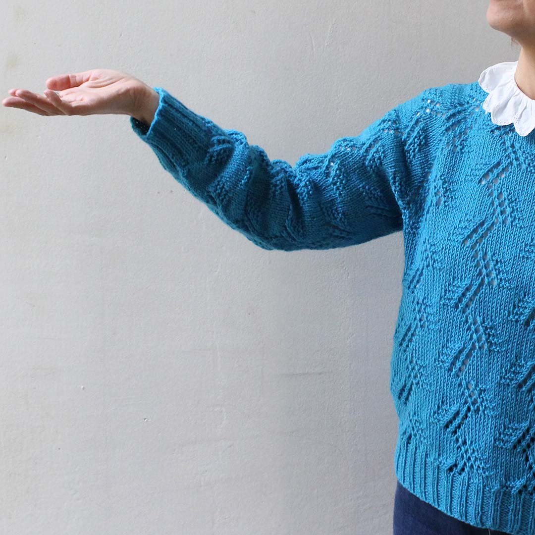 編みやすい太さ(DK)のメリノウール糸を使って、トップダウンに輪で編み進めていくプルオーバー。