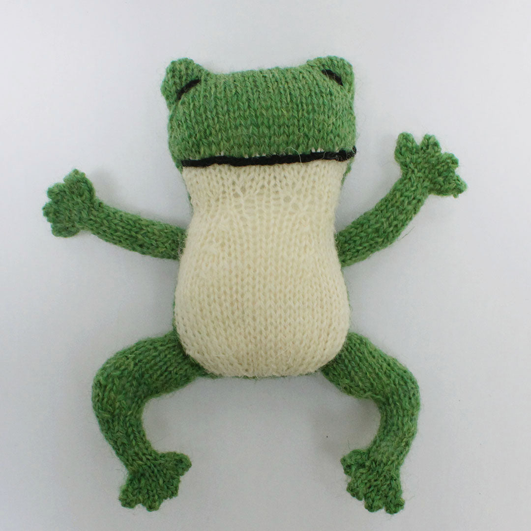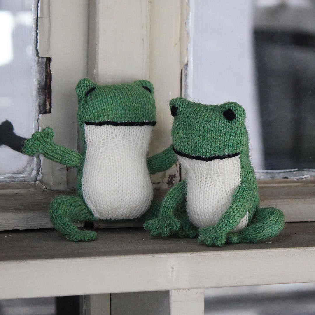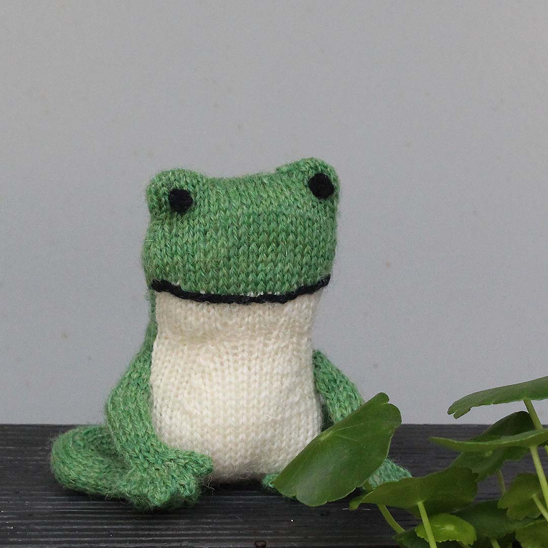 「Tipsy the Frog」は、金森さんお気に入りのかえるのぬいぐるみを、棒針編みでつくる作品として再構築したもの。