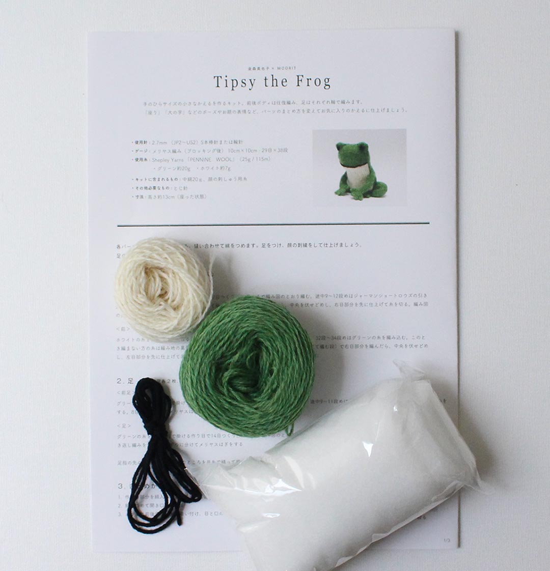 ぬいぐるみ作家 金森美也子さん×ムーリット「森のともだち」シリーズの番外編、「Tipsy the Frog」をつくるキットの登場です。