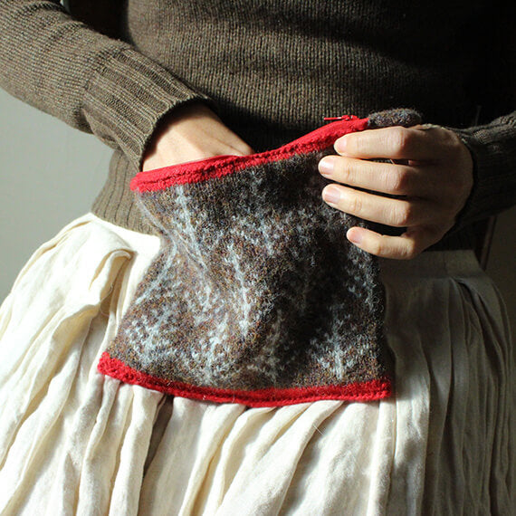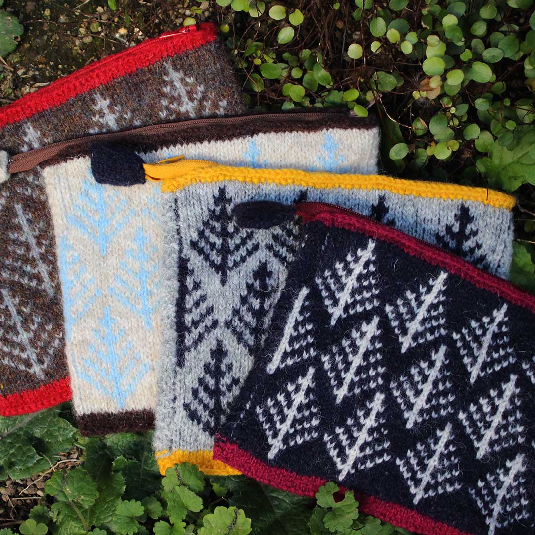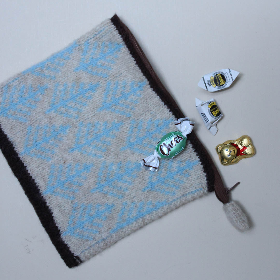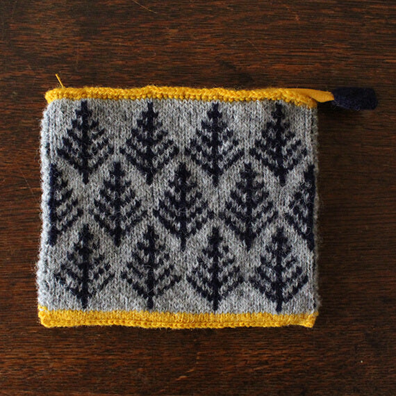 シェットランドウールを使って、北欧の森をイメージした柄を編み込んだポーチのパターンです。