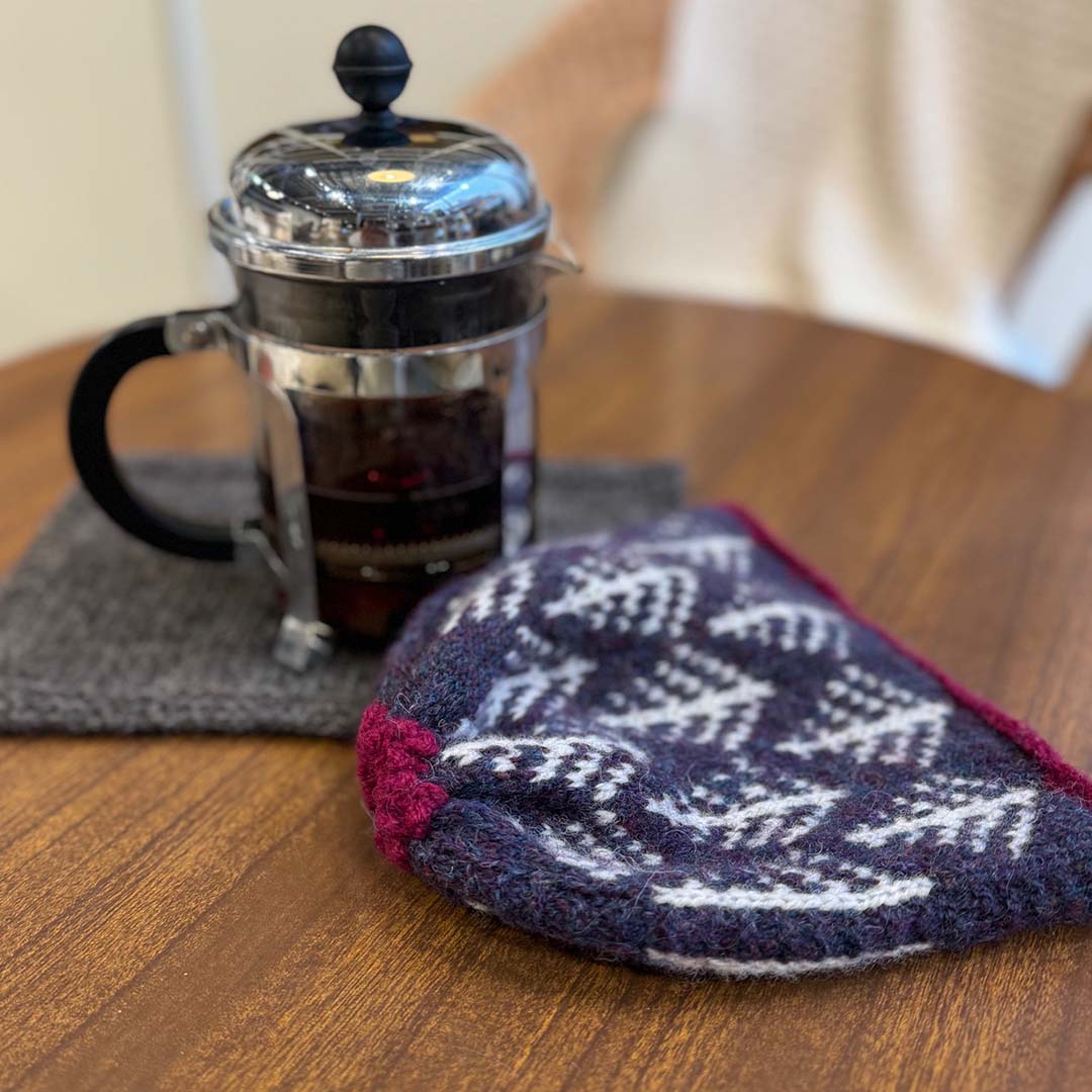 写真にあるアレンジ例では、編地のトップを絞ってティーコージーにしてみました。