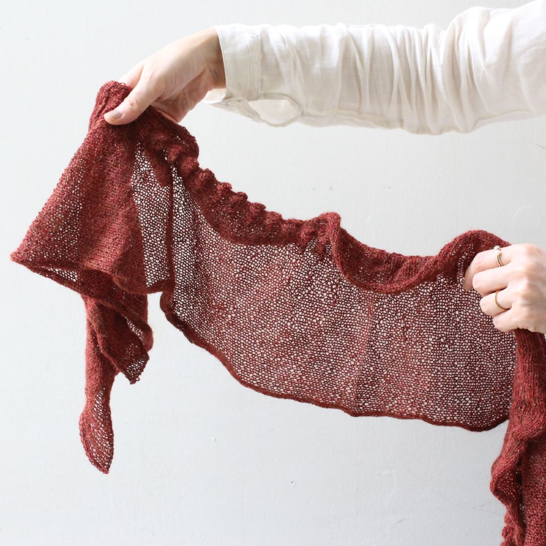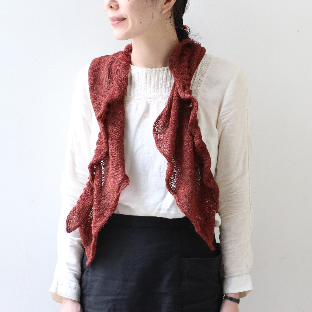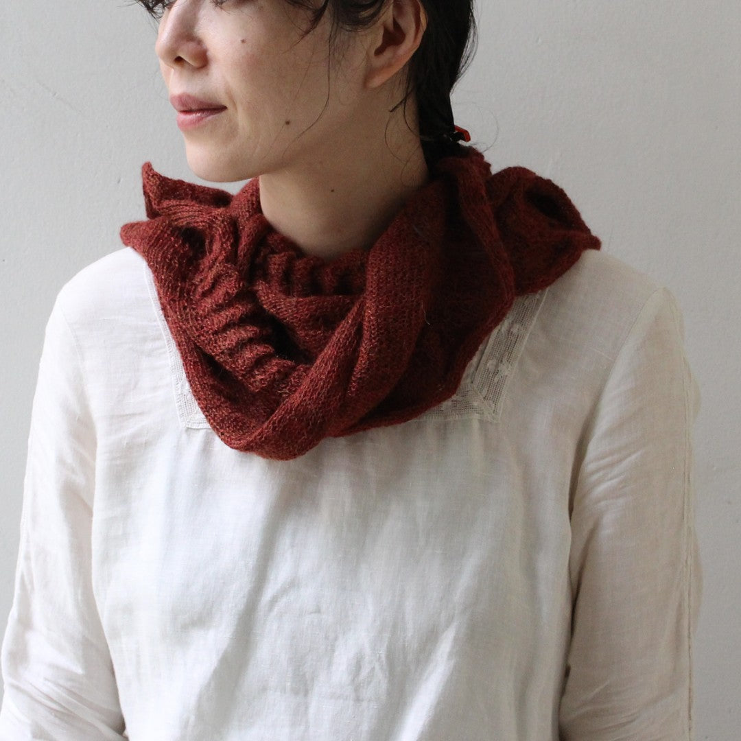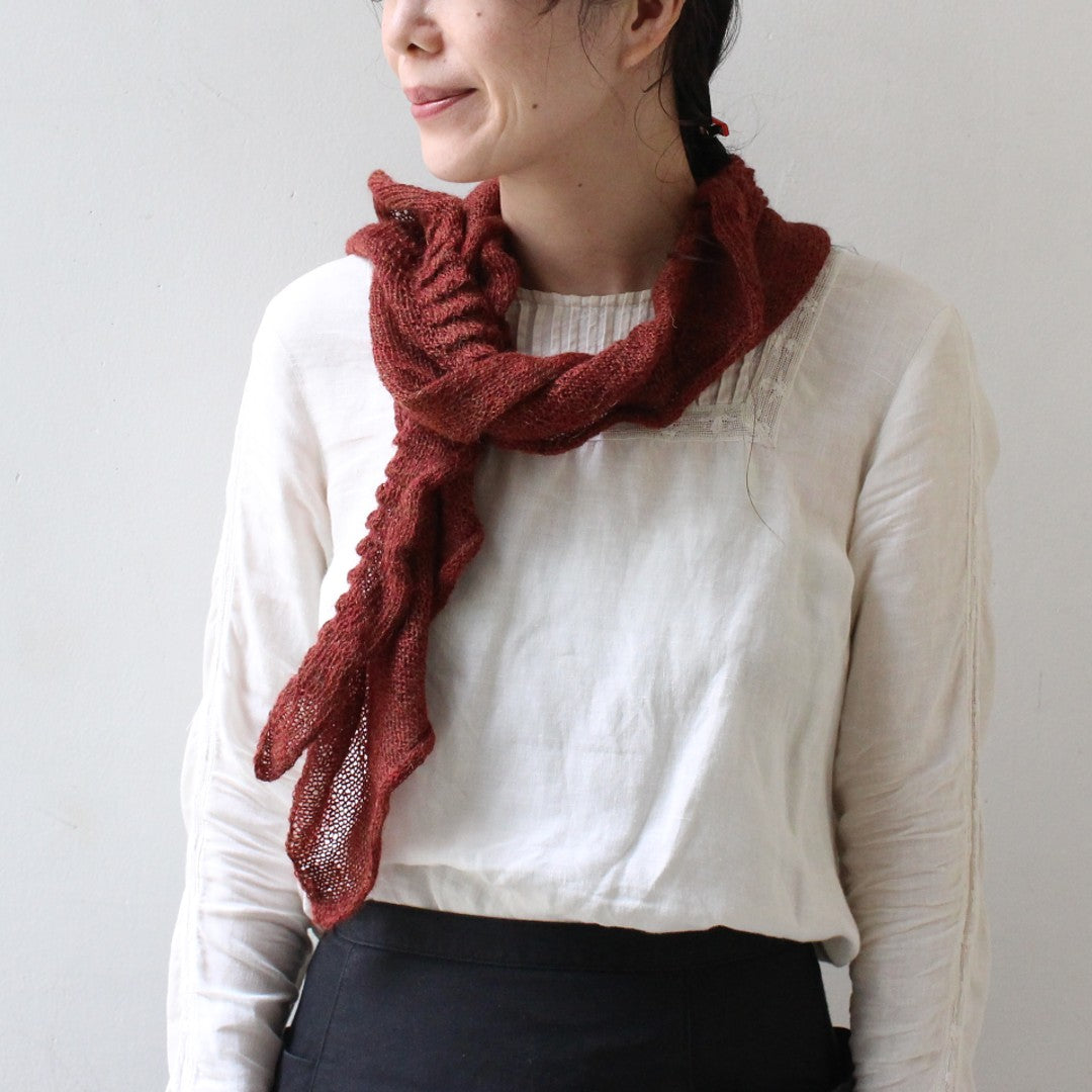 繊細なレースウェイトの糸を、少し大きなサイズの針でふんわりと編み上げる軽やかなスカーフ。