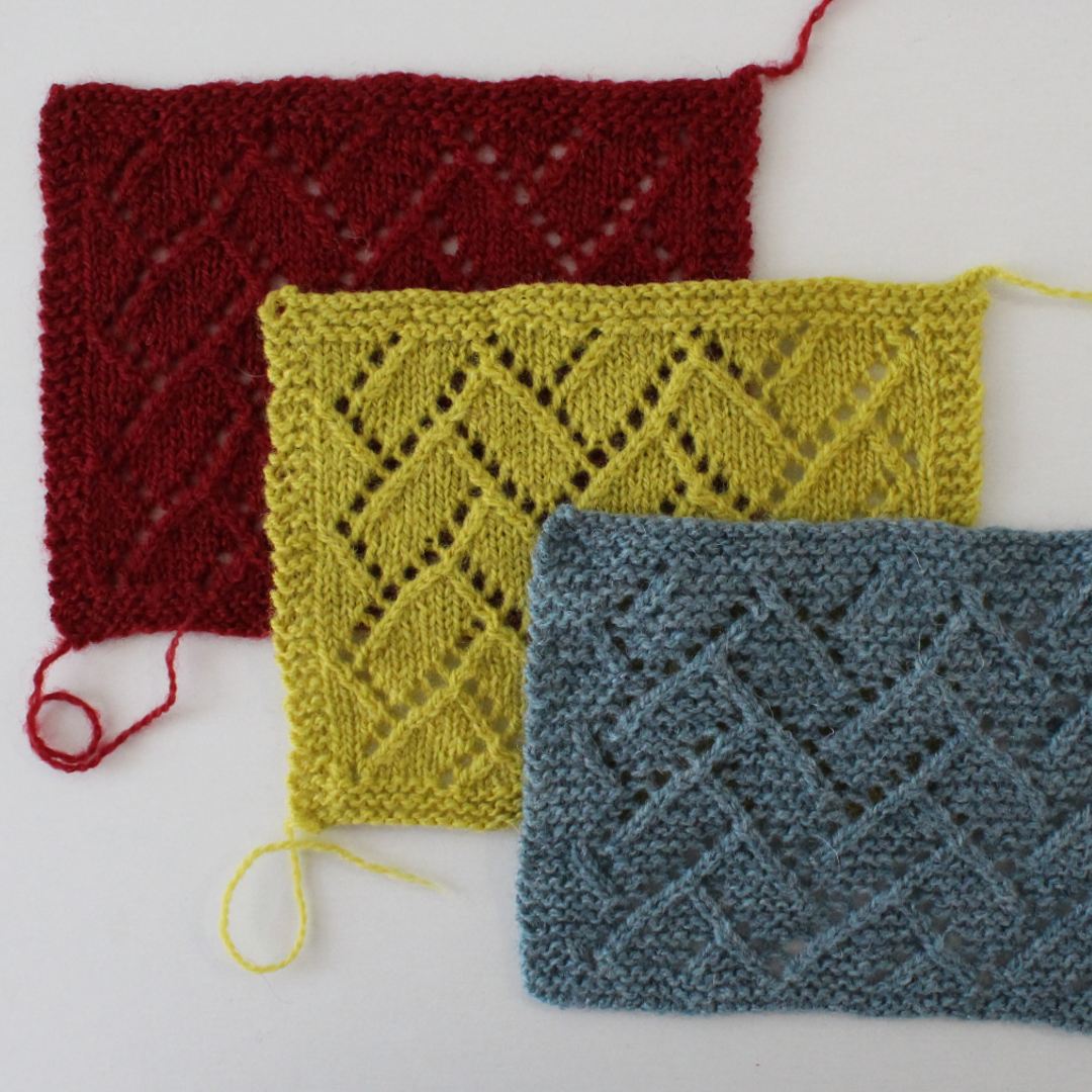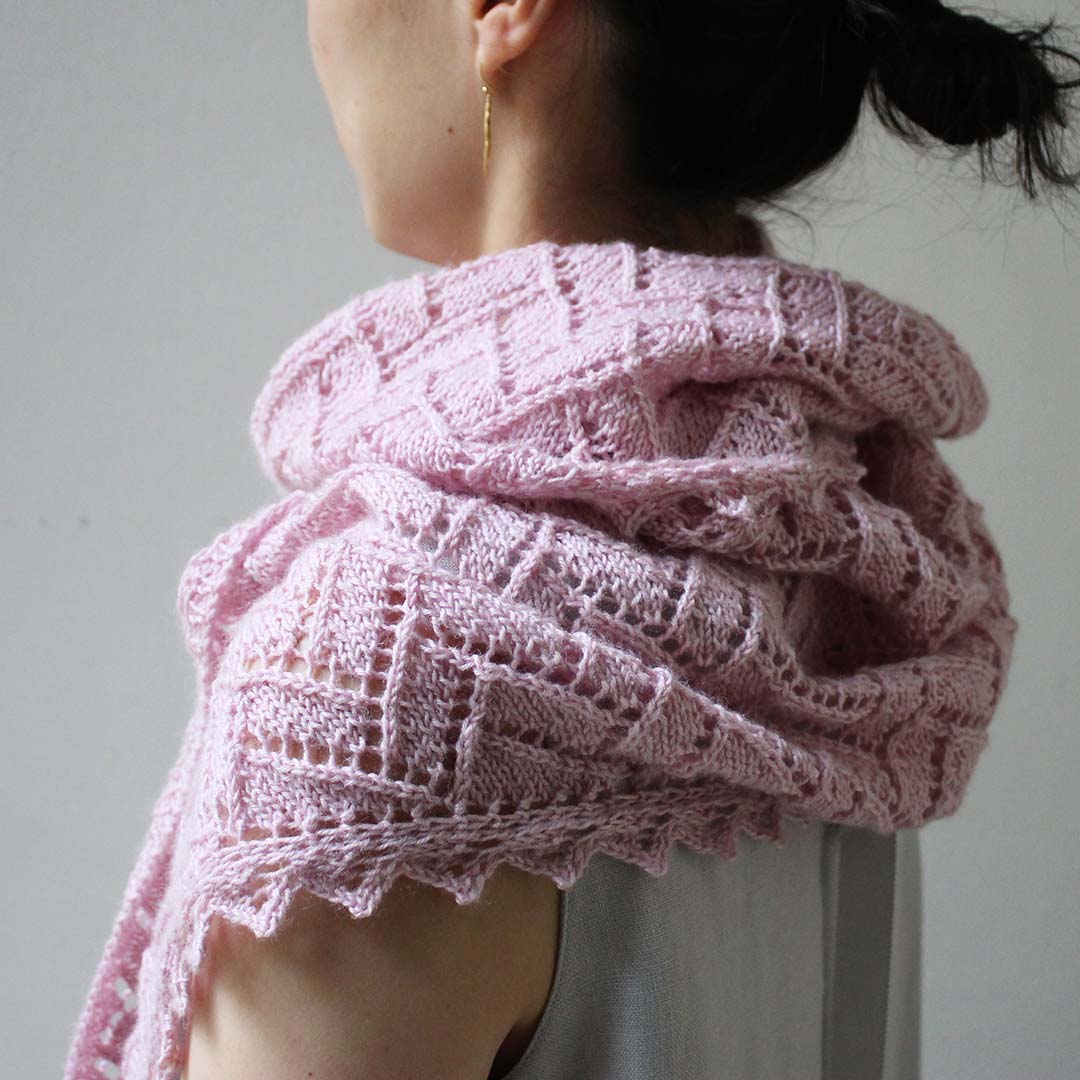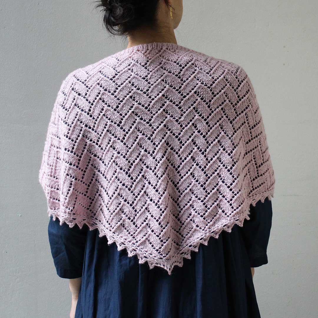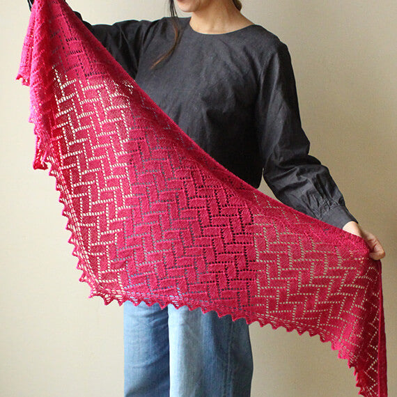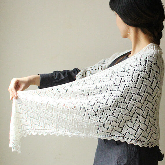 長方形がジグザグに並んだ寄せ木模様が美しいショールを編むパターンです。