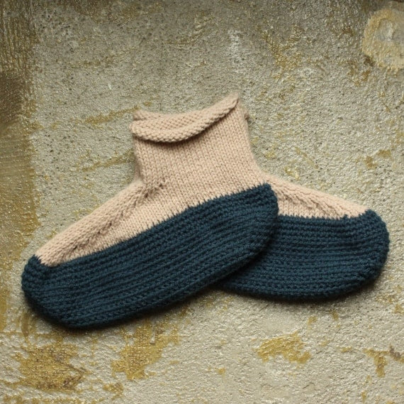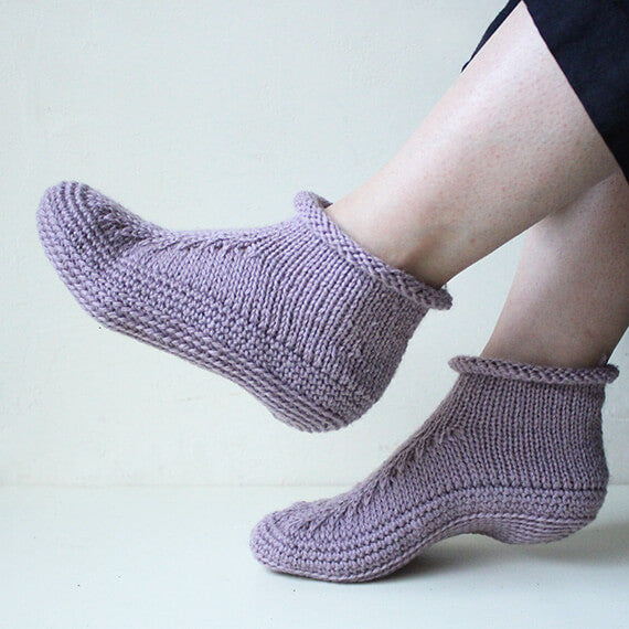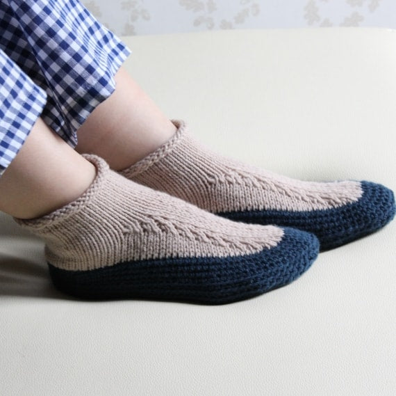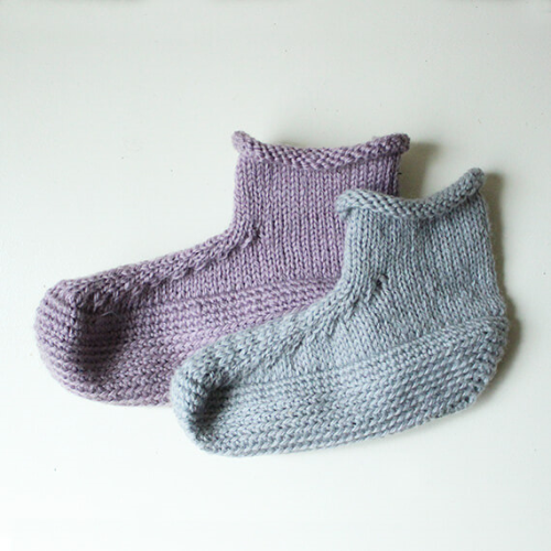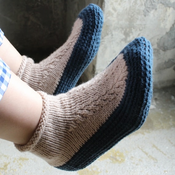 かぎ針で底をしっかりと編み上げてから、棒針編みで甲から履き口に向かって進めるルームシューズのパターンです。