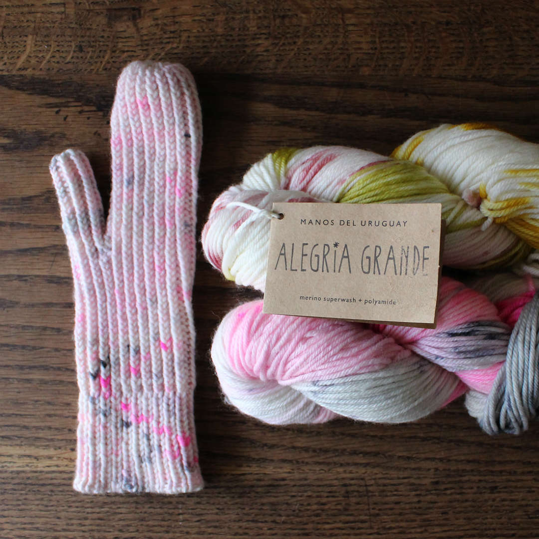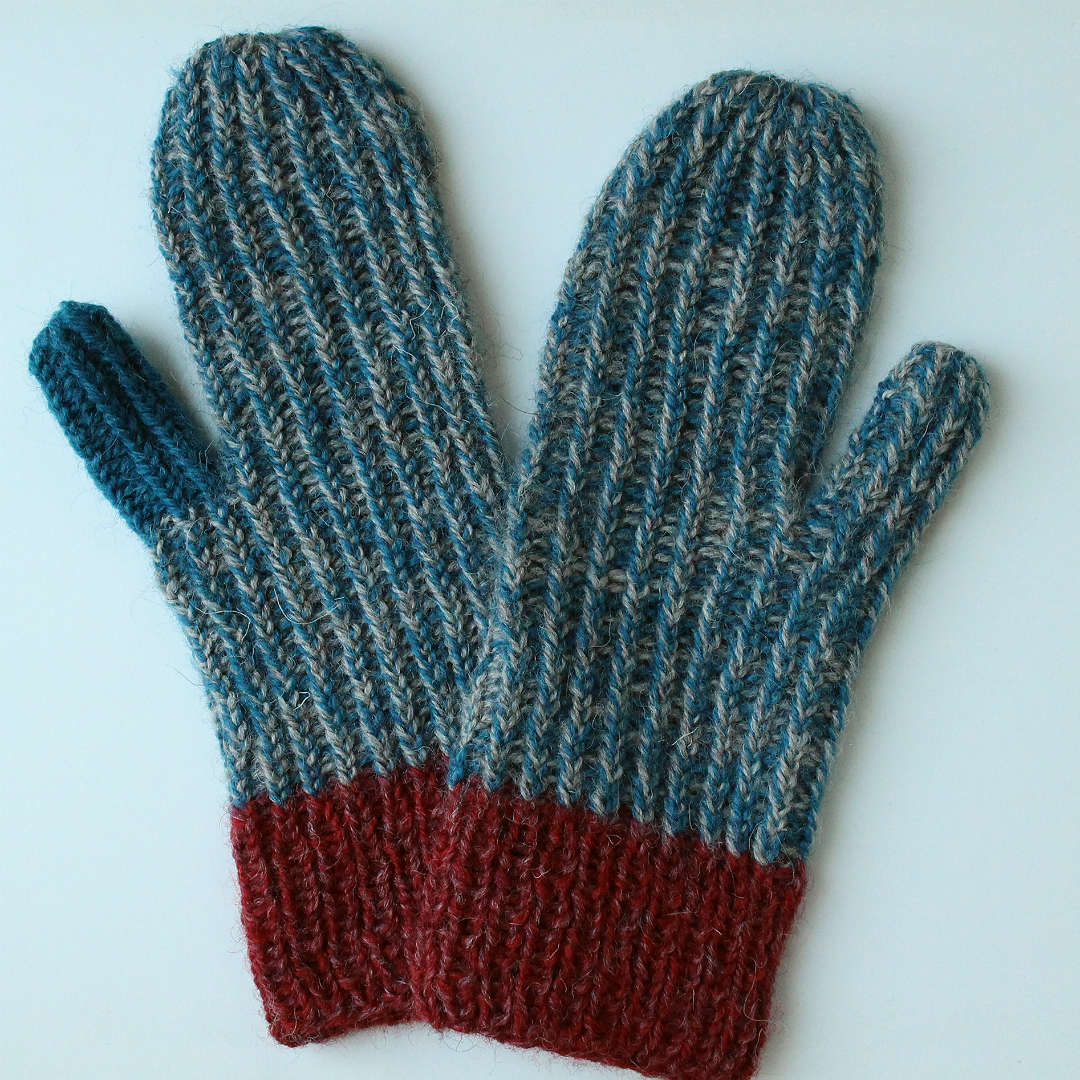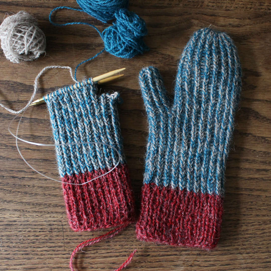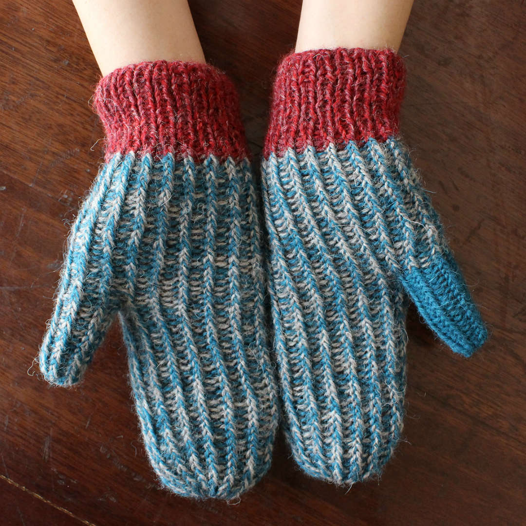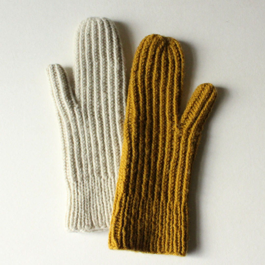 ゴム編みの特性も活かして、手にフィットさせるミトン。左右同じものを編みます。