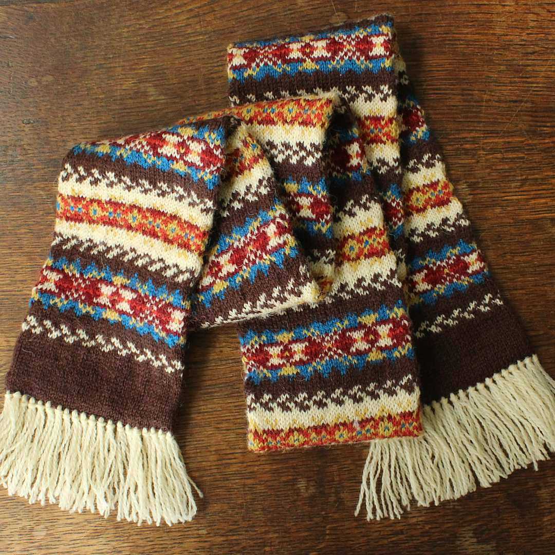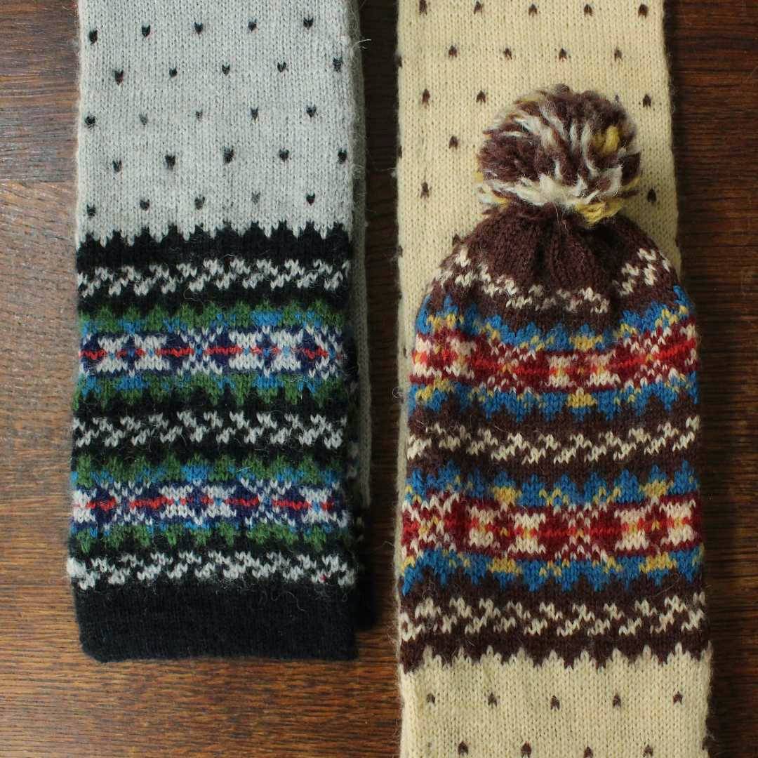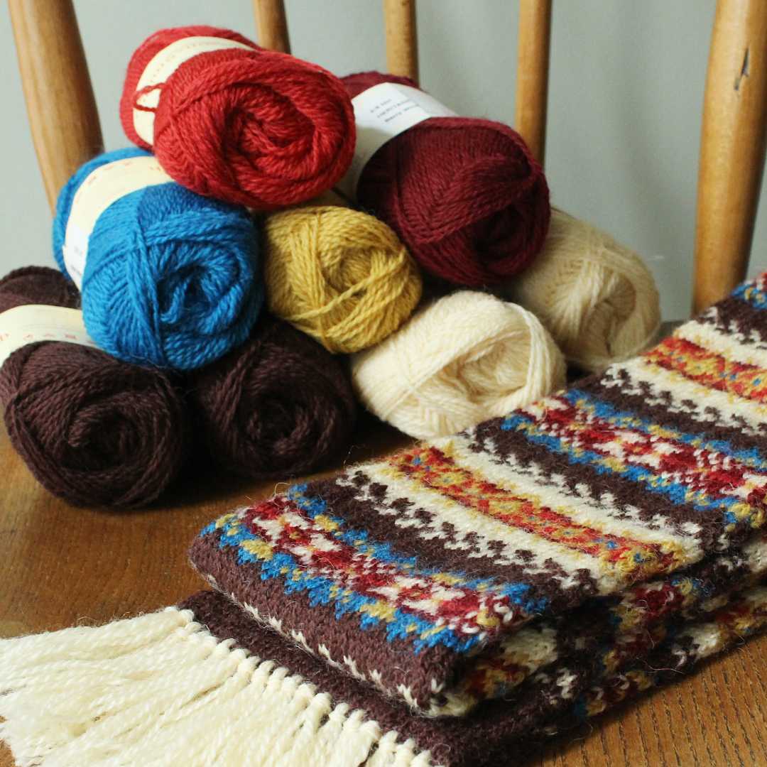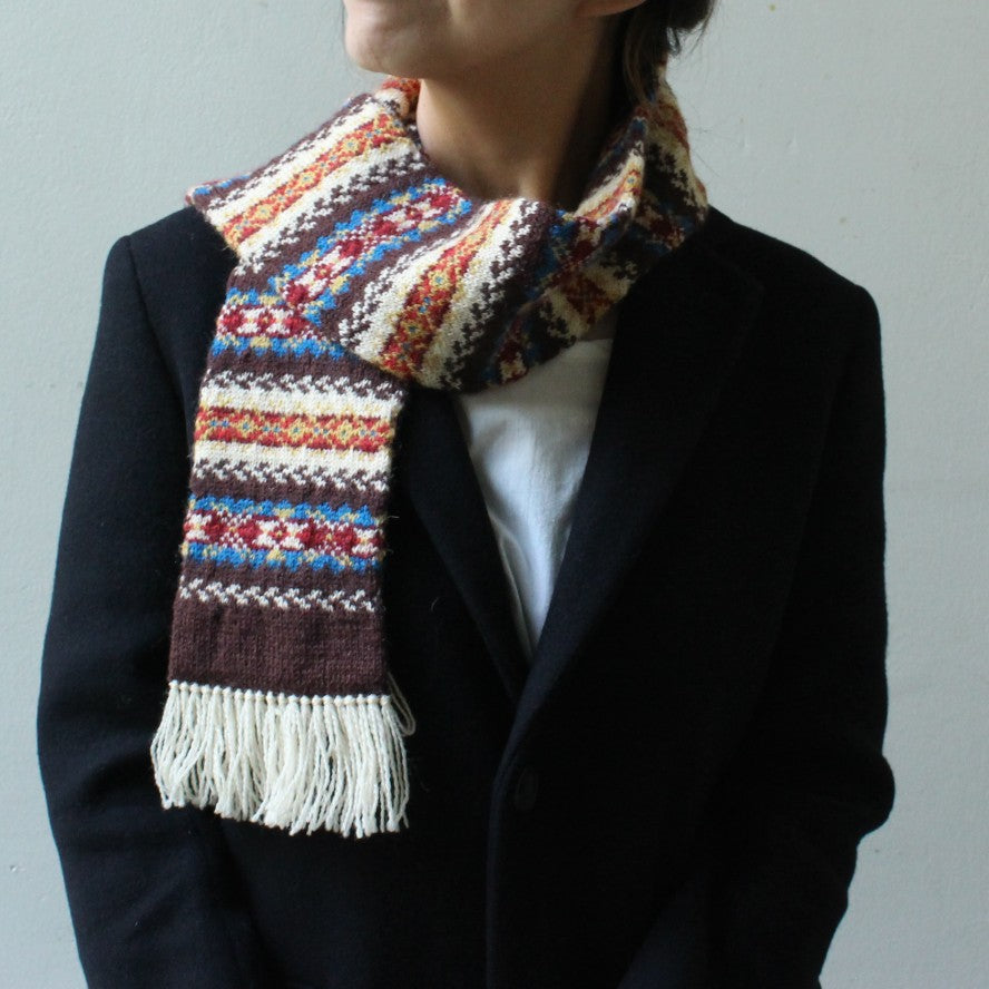 たくさんの色をつかって、細やかな模様を編み込むフェアアイルマフラー。