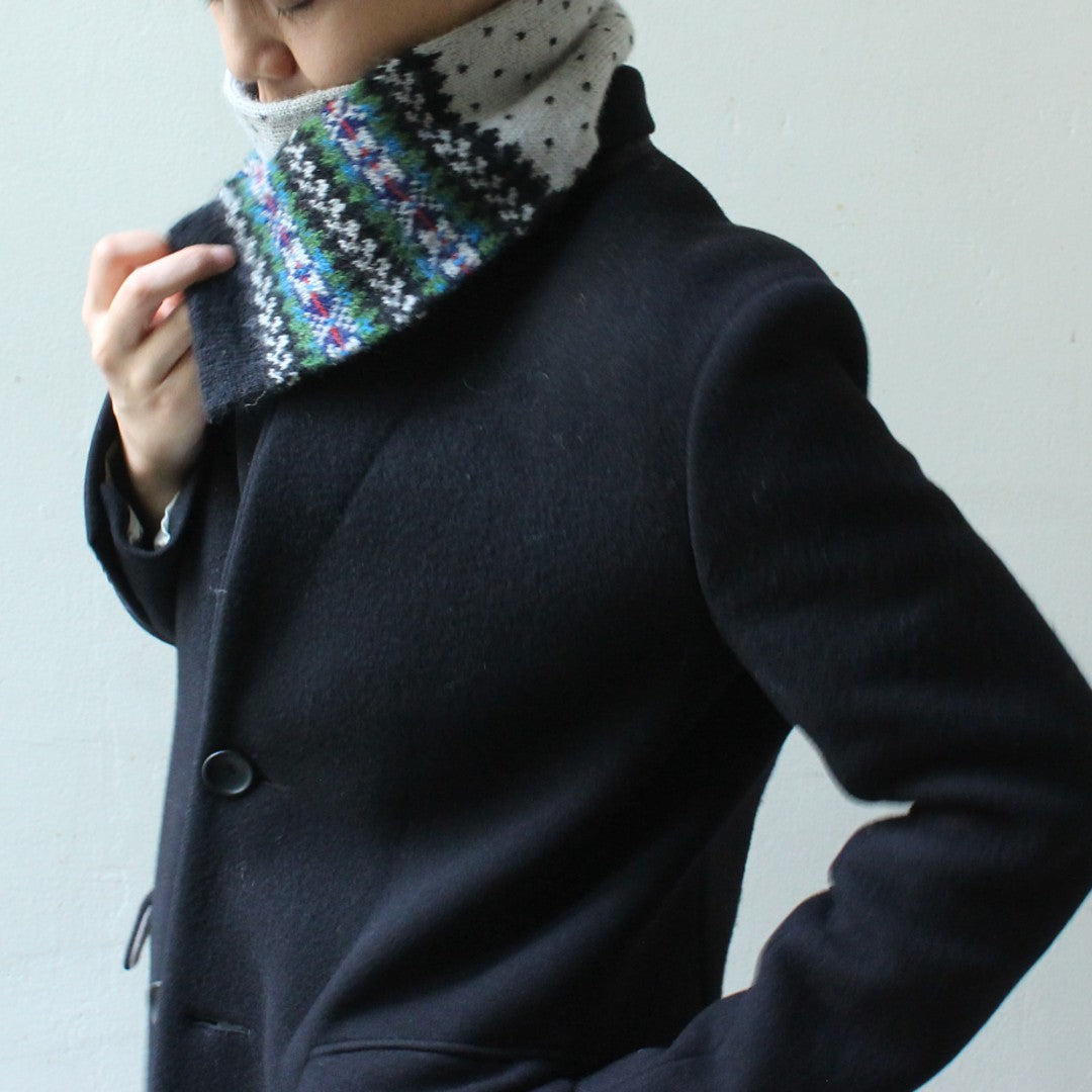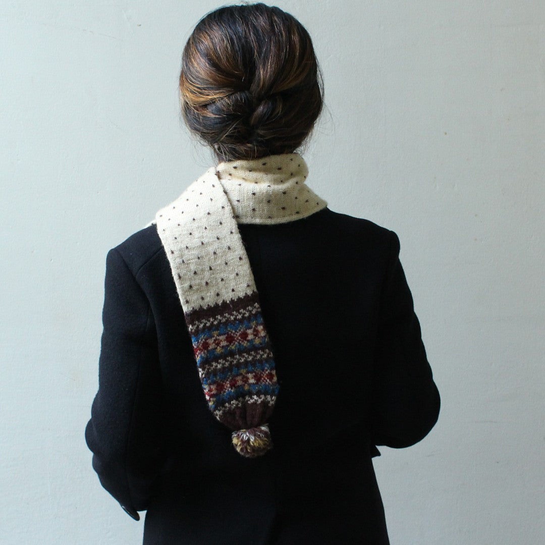伝統的な柄からイメージを膨らませて、襟元にきゅっとひと巻きするあたたかなマフラーにしました。