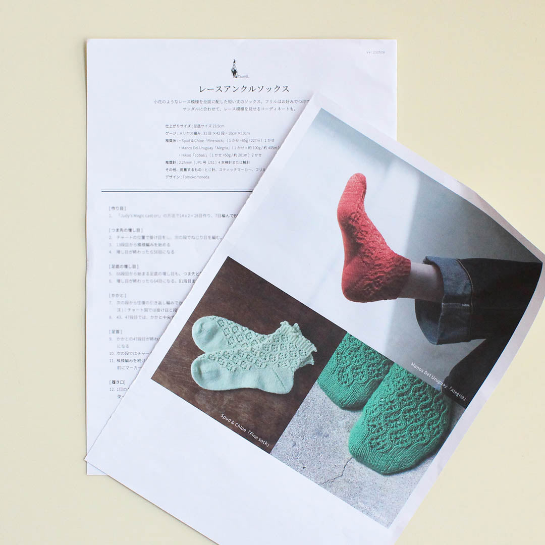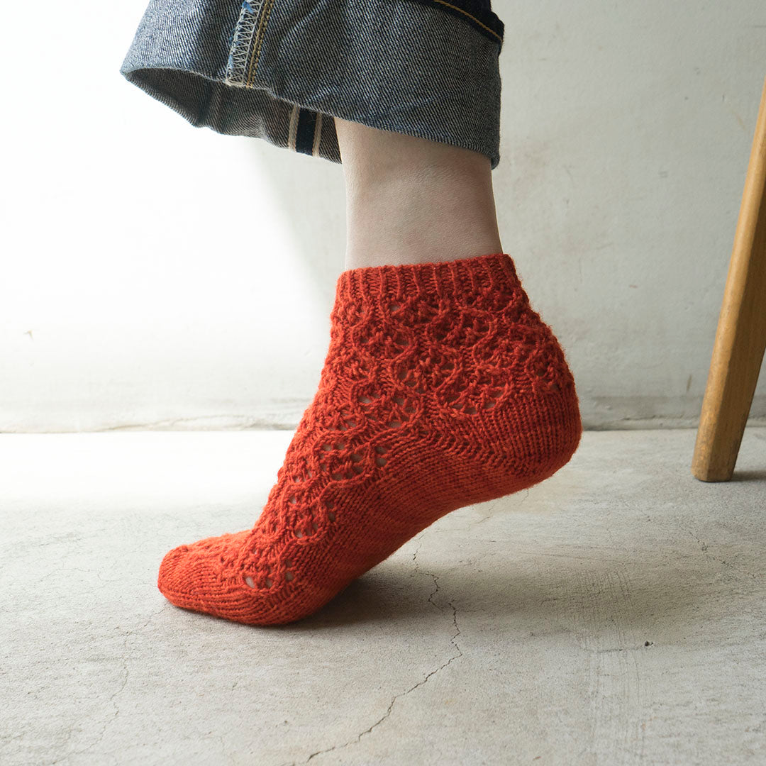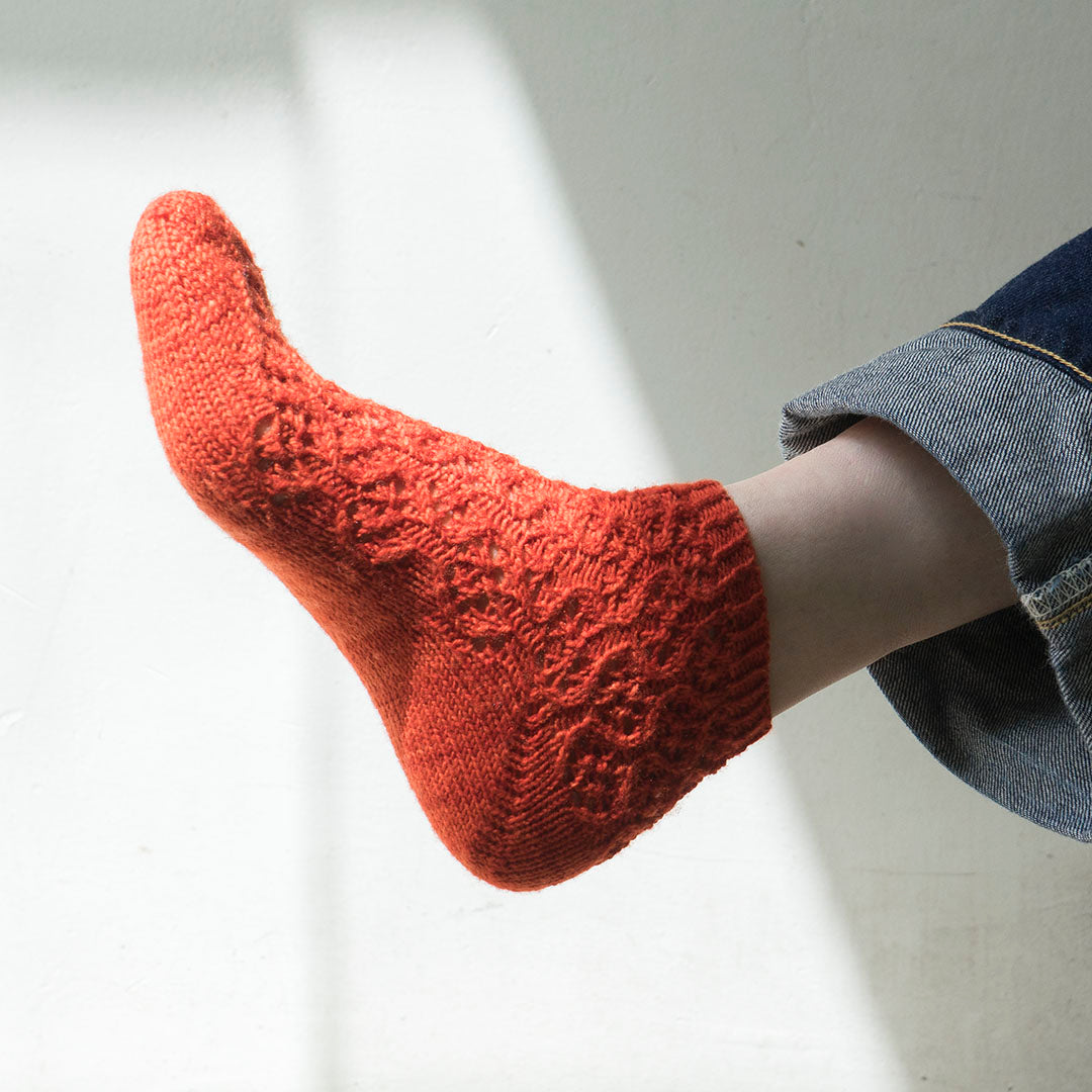 小花のようなレース模様を前面に配した、アンクル丈のソックスを編むパターン(印刷版)です。