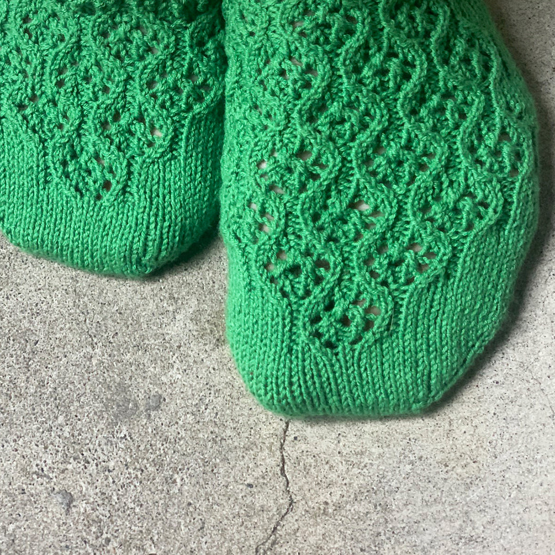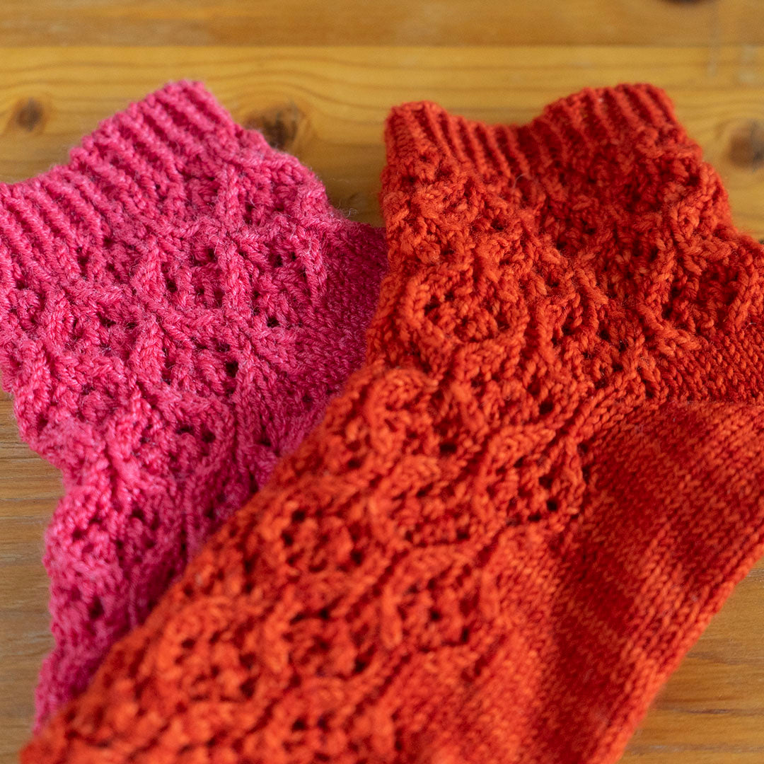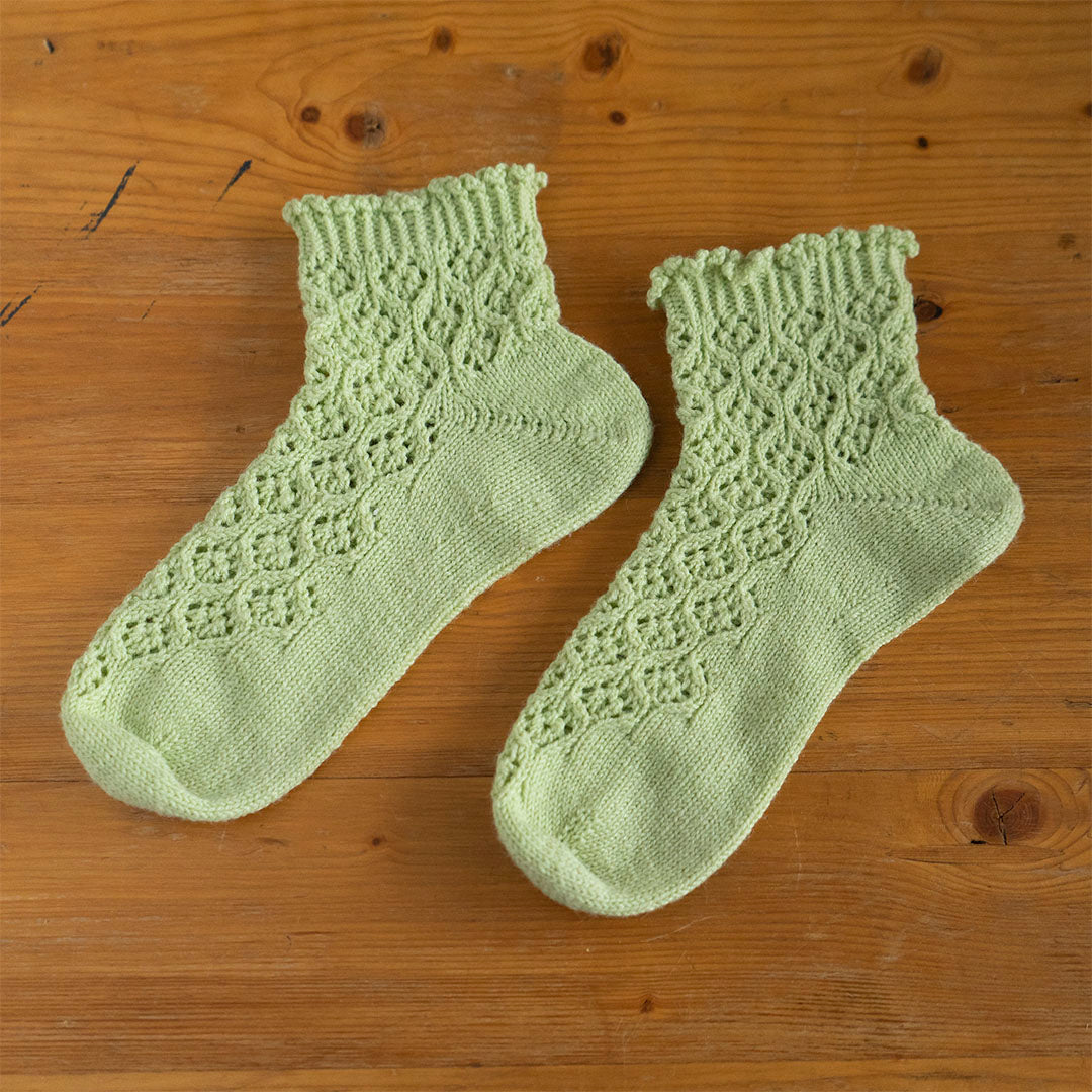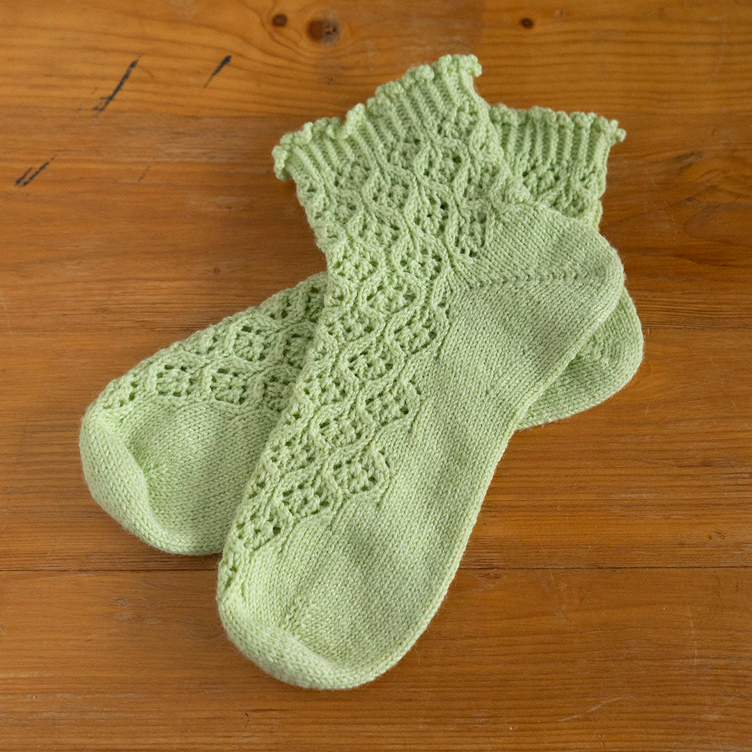 小花のようなレース模様を前面に配した、アンクル丈のソックスを編むパターン(印刷版)です。