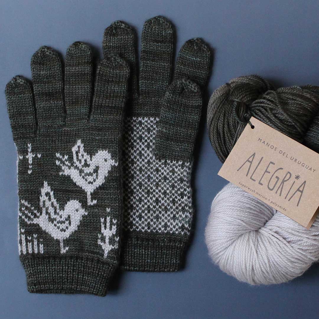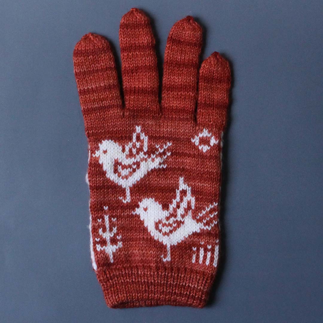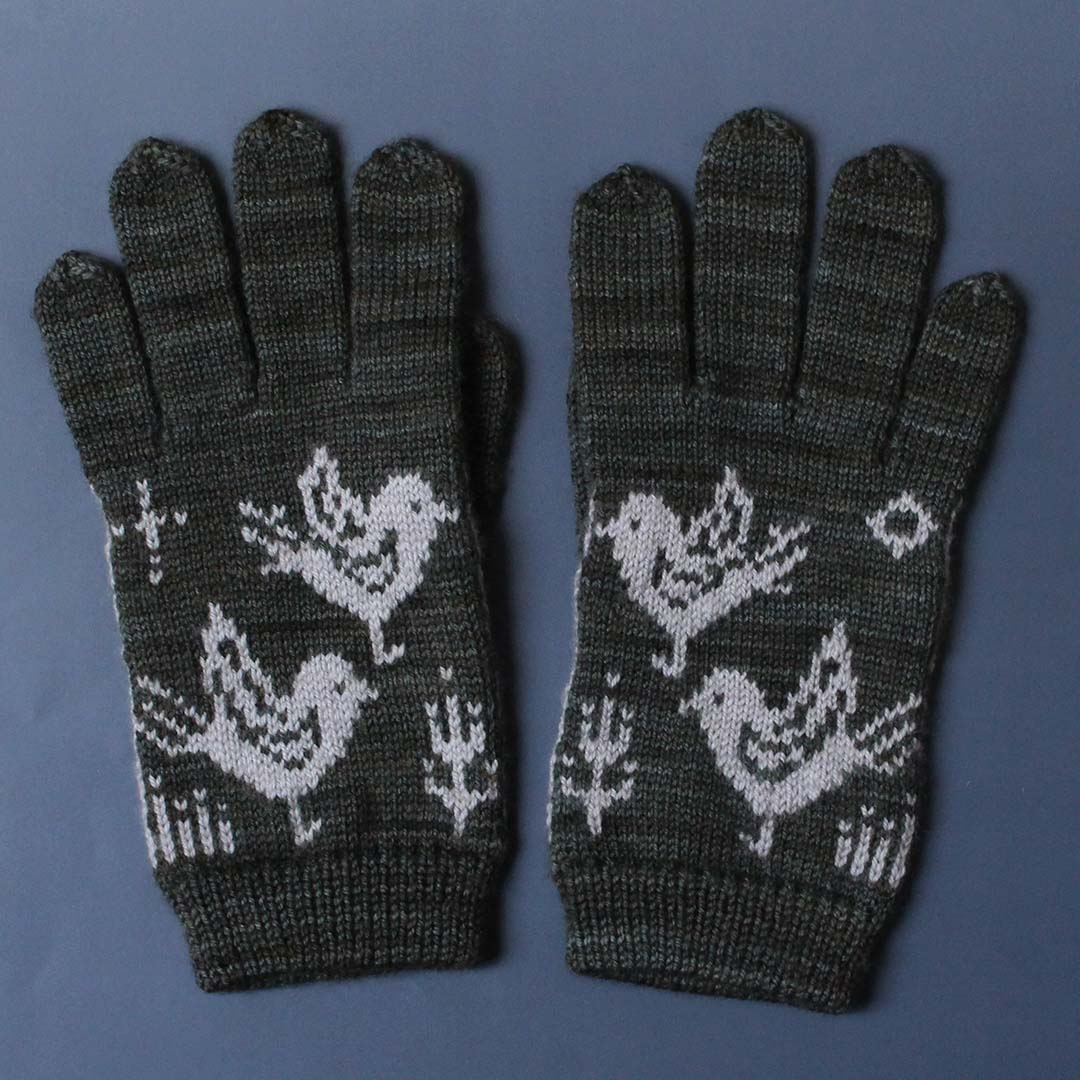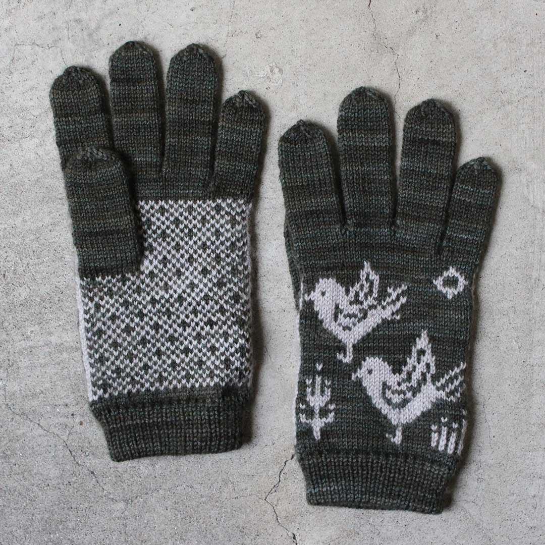 小鳥の模様を編み込んだ5本指手袋のパターン。作品例では、ソックヤーン「アレグリア」を2色、各50g使用して編んでいます。
