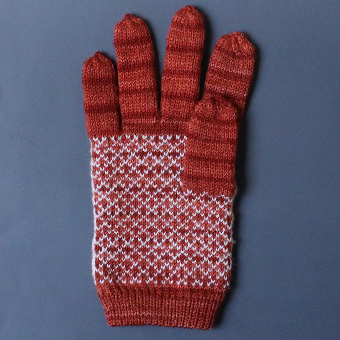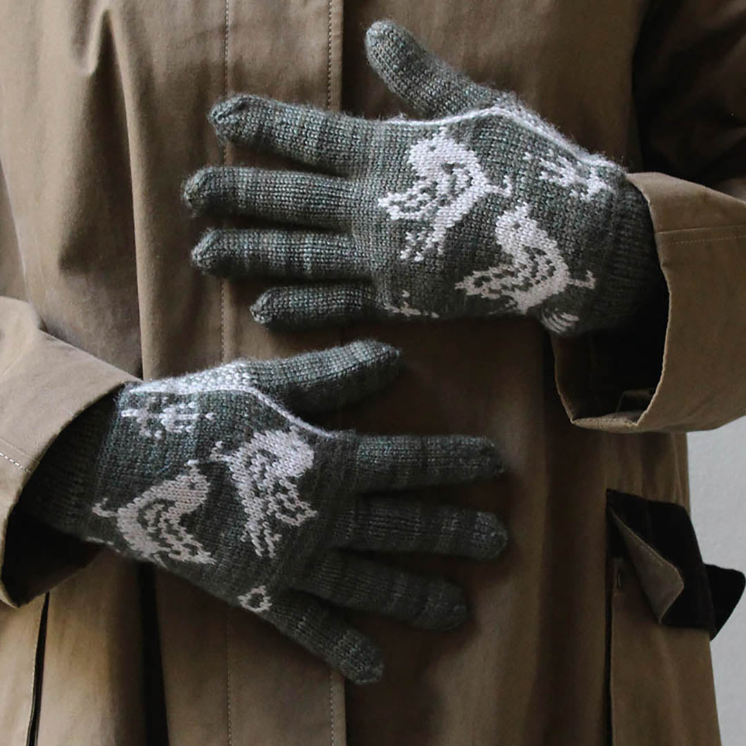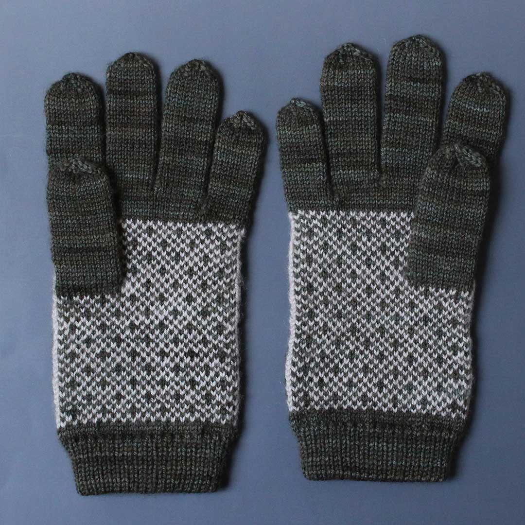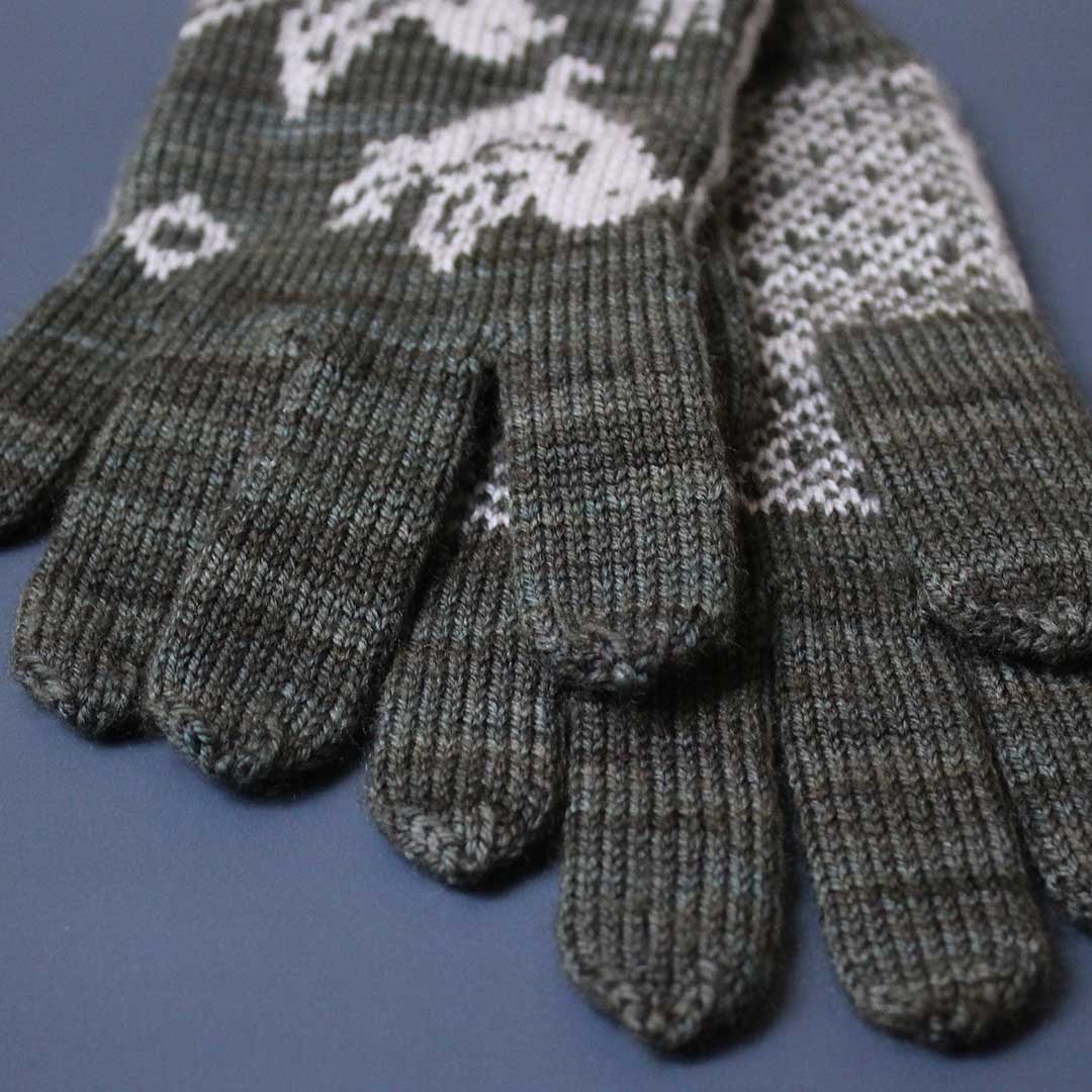 小鳥の模様を編み込んだ5本指手袋のパターン。作品例では、ソックヤーン「アレグリア」を2色、各50g使用して編んでいます。