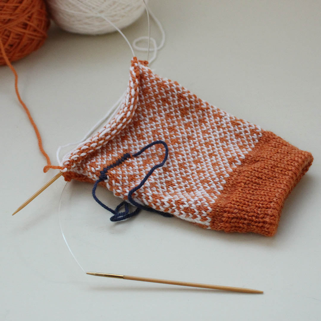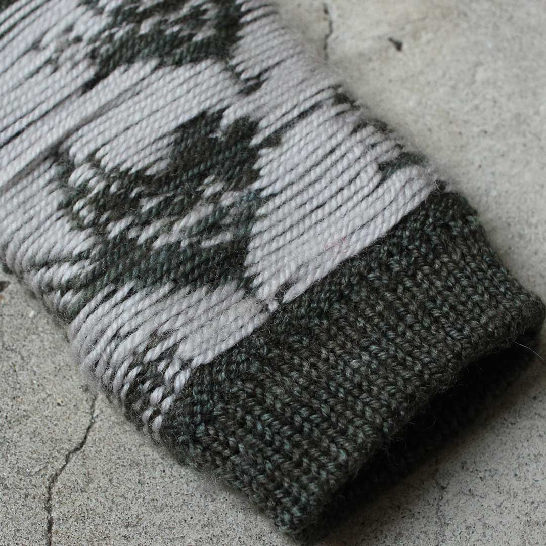 編み込では編地の裏側に糸が長く渡る場合、編みくるんだりからげて配色糸を短く調整することがありますが、アレグリアは毛羽立ちがすくないため、この方法だと表側に響いてしまいます。