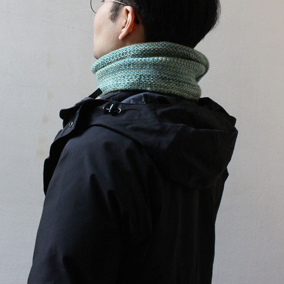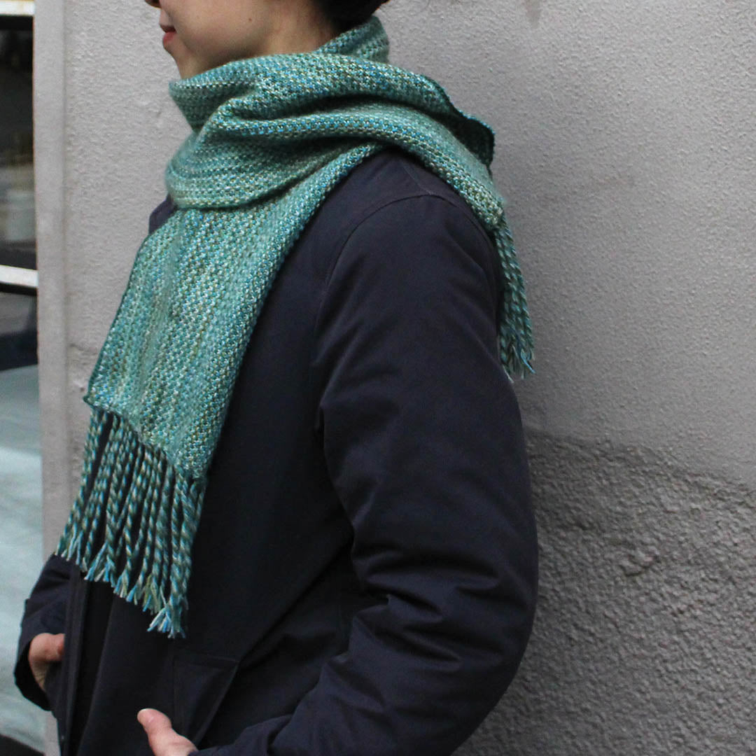 二つ折りにしにてスキニーなスカーフのようにしたり、コートの中の襟元にあわせても、肌ざわりよくあたたかです。