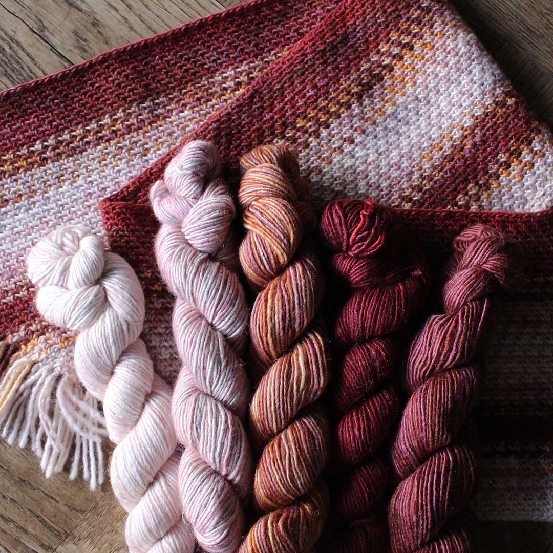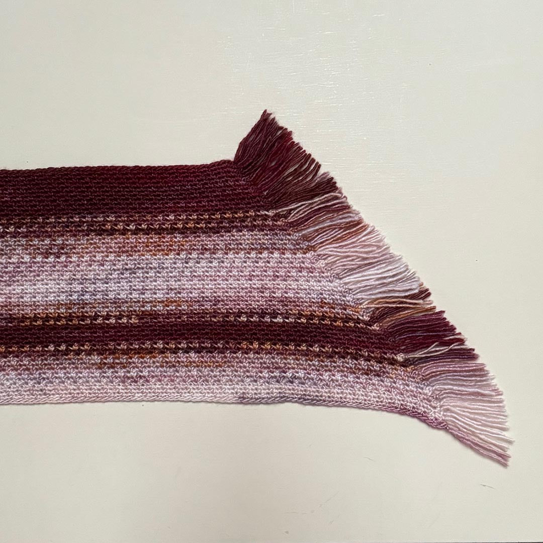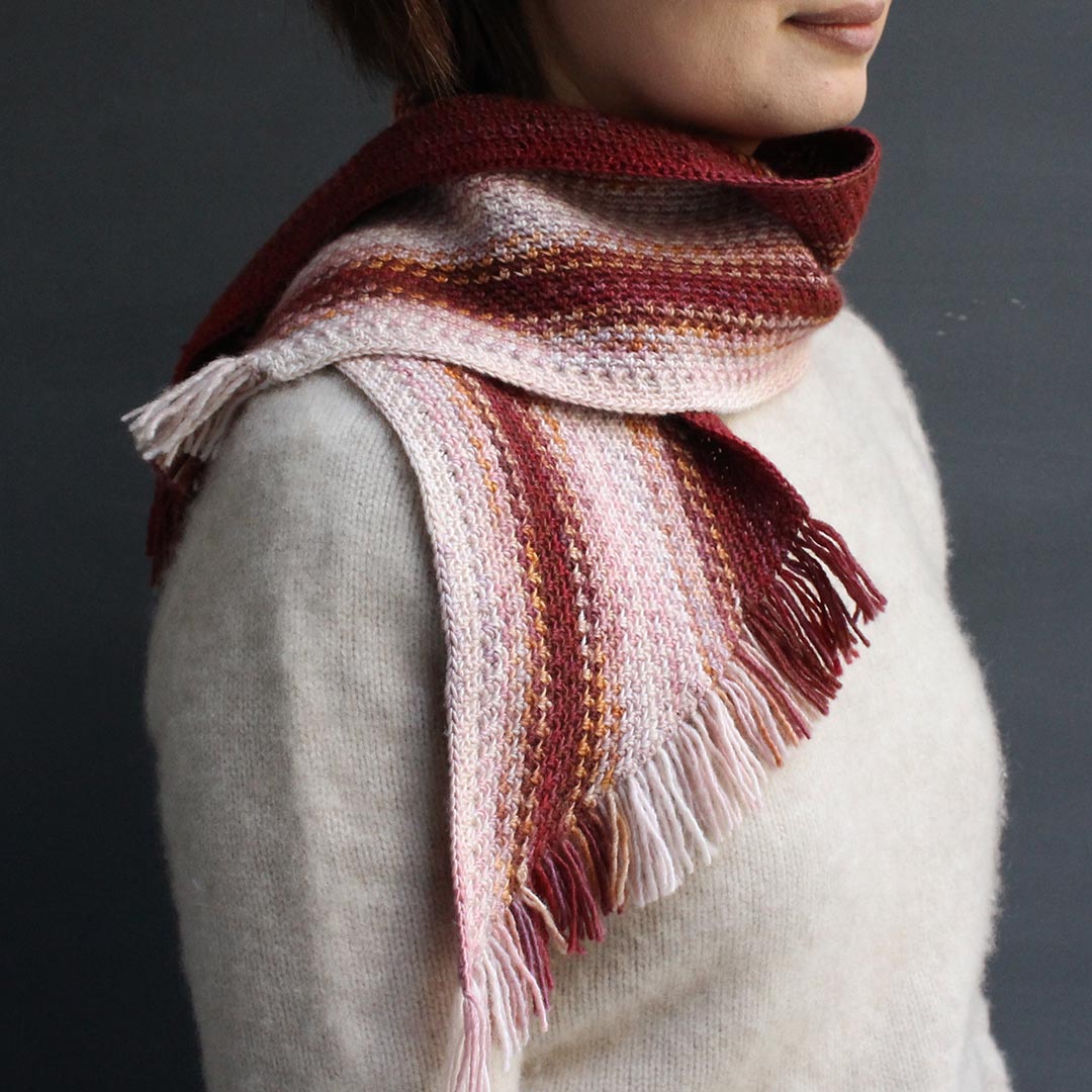 5色を効果的に使えるよう、かぎ針編み・棒針編みともに常に編地の表側を見て、毎段糸を替えながら編むパターンにしました。両作品ともに長辺から編みはじめ、糸端をフリンジとして利用しています。