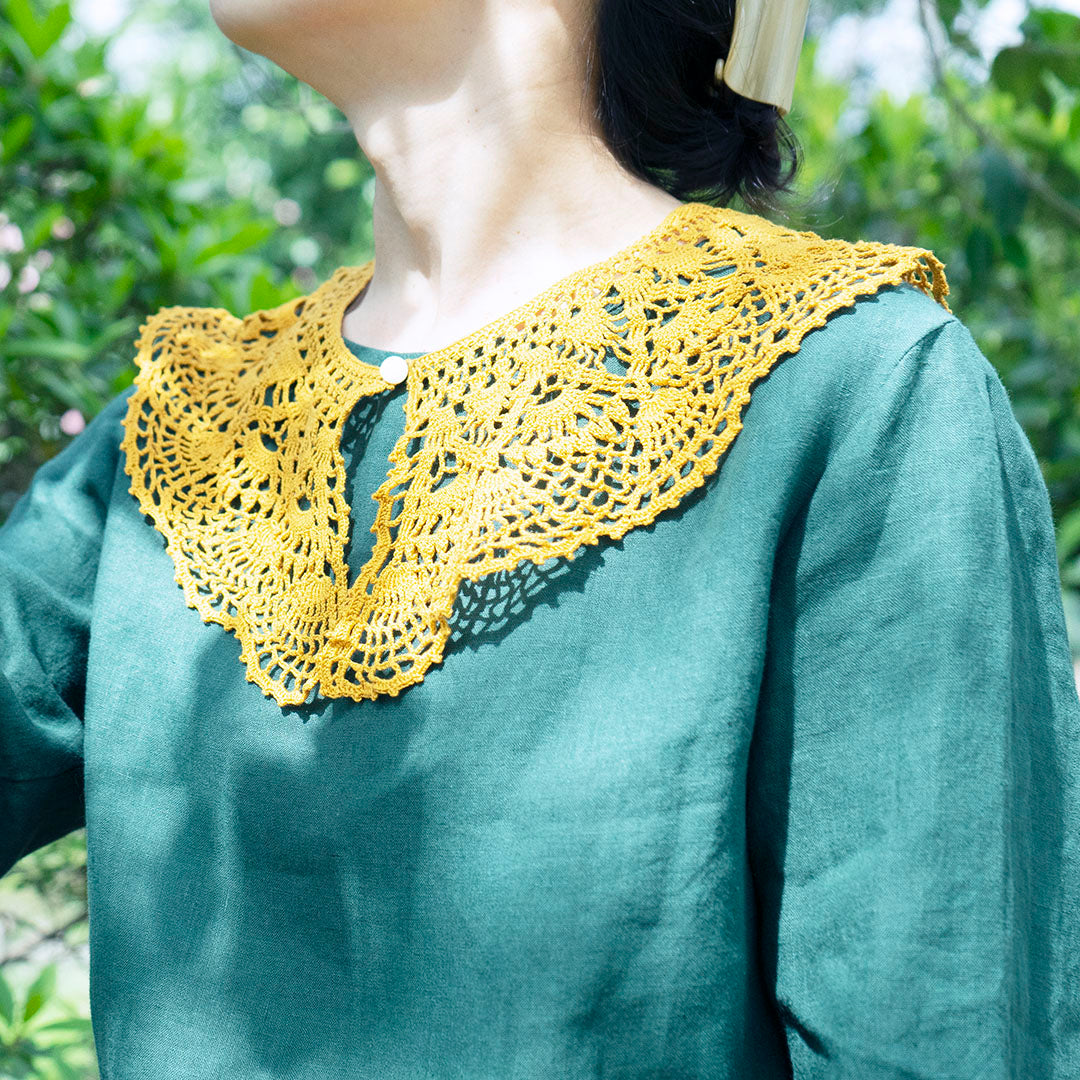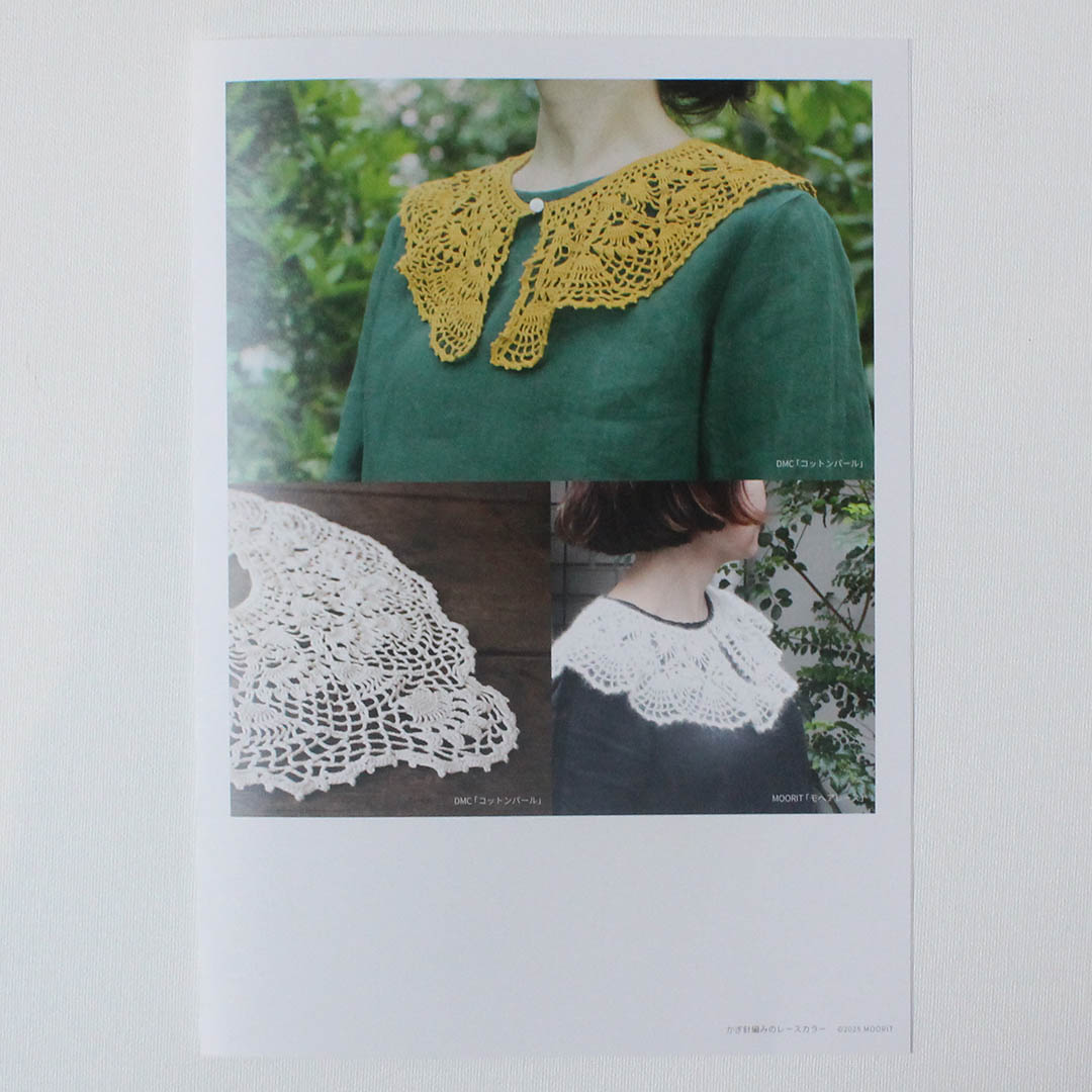 コットンのレース糸で編んだ作品なら、ブラウスやワンピース、シンプルなニットのほか、Tシャツなどにあわせても。