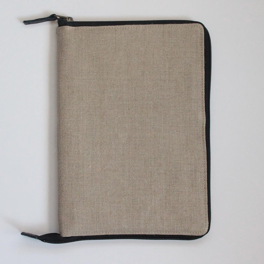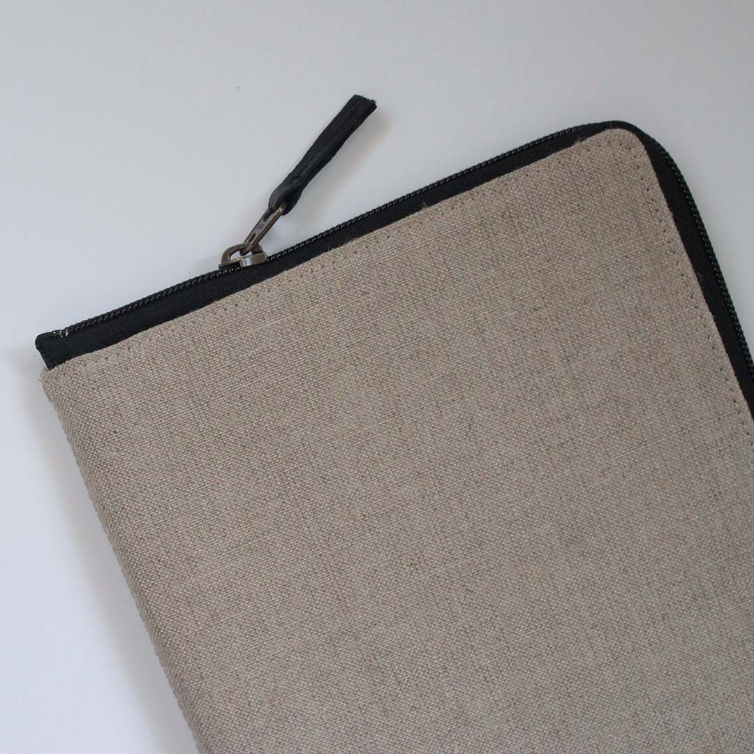 リネンのオリジナルケースは、周囲のファスナーがアクセント。ファスナーを開けるとしっかりと見開きの状態になって、パーツの出し入れもスムースです。ケースの右側にはポケットがあるので、編み物に使う小さなお道具を一緒にしまっておくことができます。