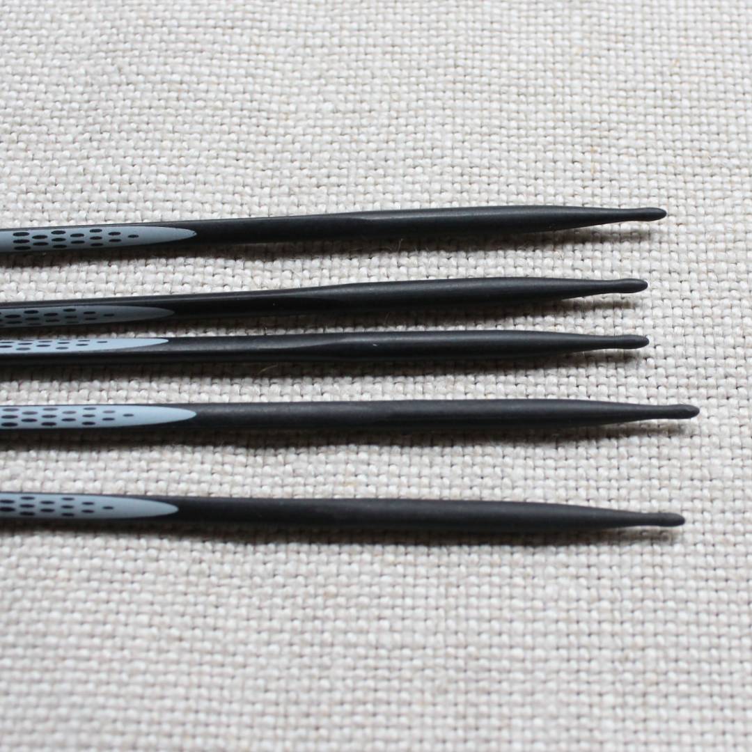 「カーボンテクノロジー」はクラシカルな雰囲気の両先5本棒針。カーボンを配合した特別な合成素材でつくられ、プリムのエルゴノミックシリーズの棒針の中でも特に軽量で丈夫な仕様になっています。