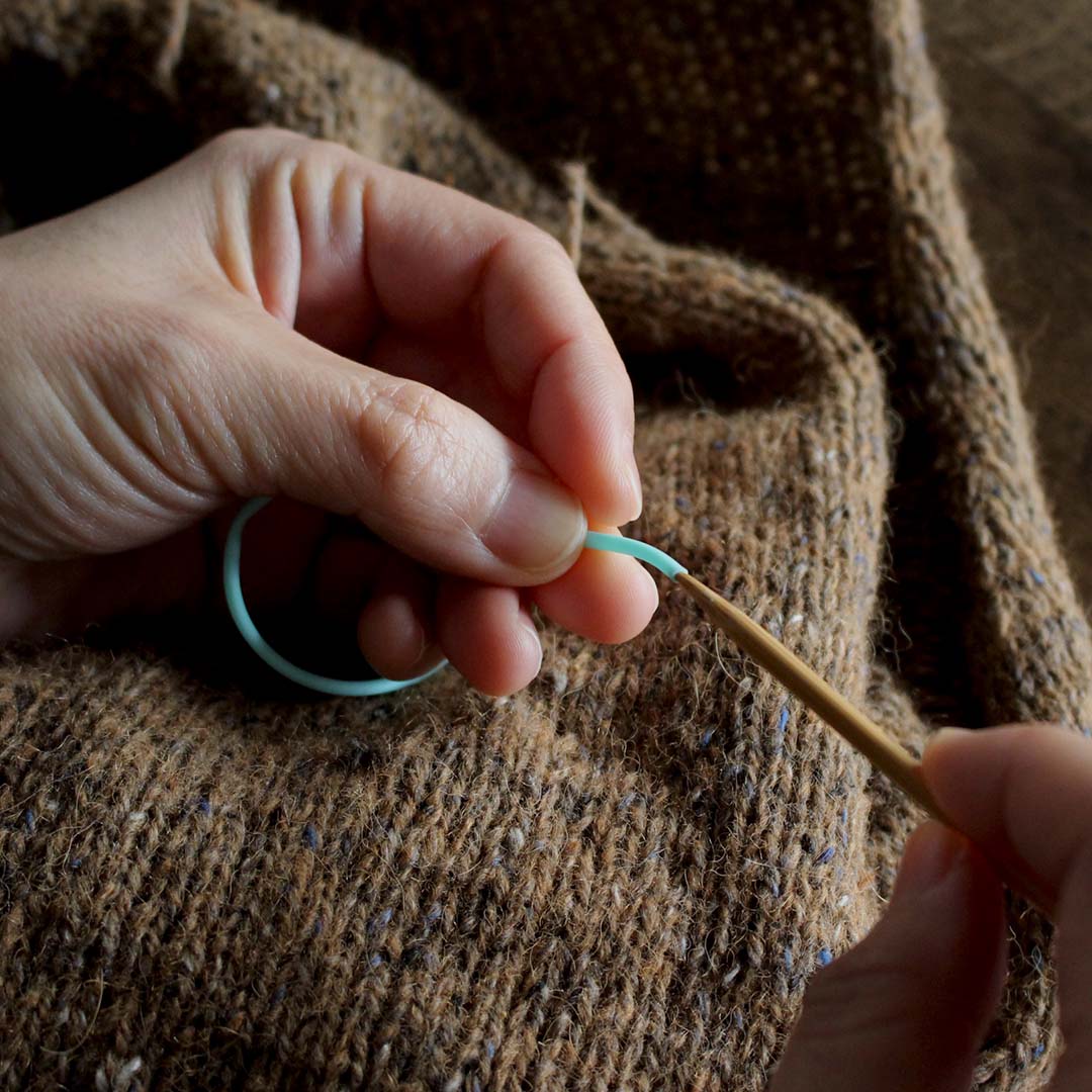ラバーチューブに針先を差し込み、編み目をスライドさせて目を休ませます。