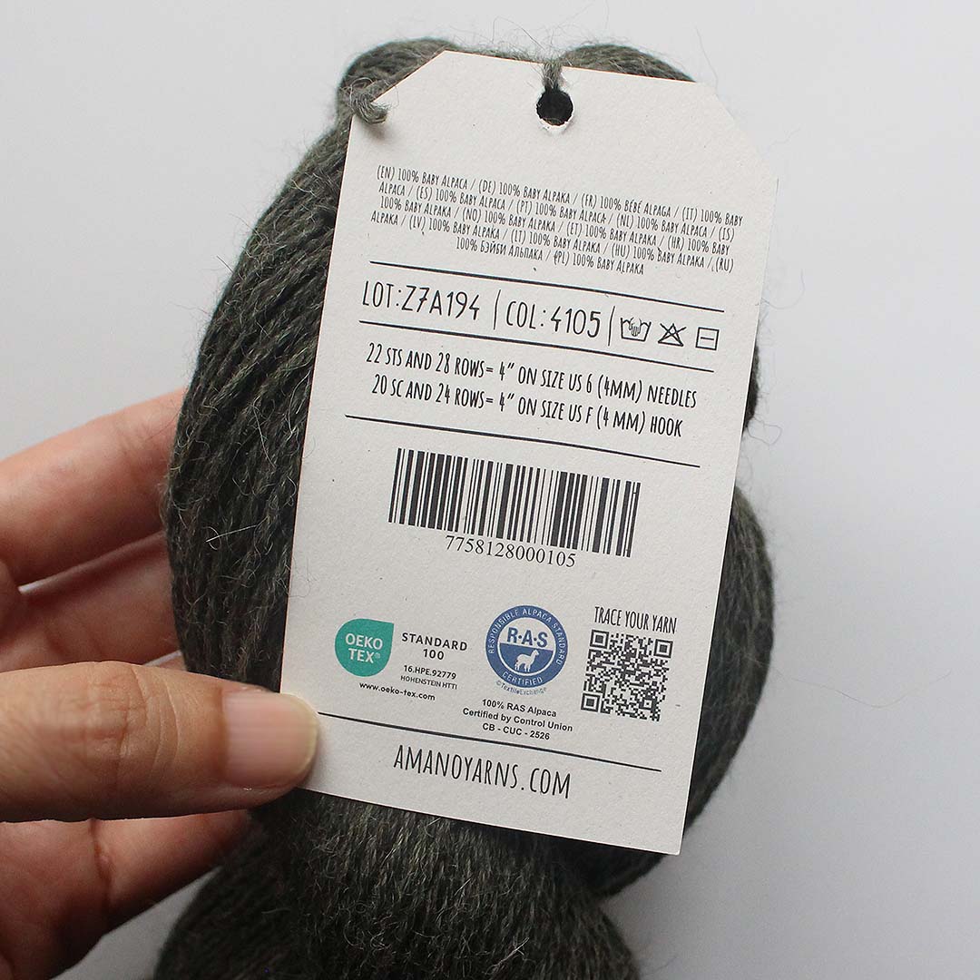 有害な化学物質を含まず肌に直接触れても安全であること、持続可能であることを認証する国際的なマーク「エコテックス」と、アルパカが責任ある飼育環境で育てられ、高地アンデスの生態系が持続的に管理されていることを保証する「RAS」マークつきの手編み糸です。