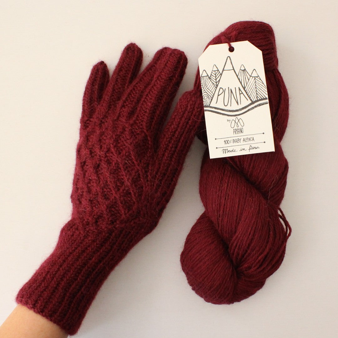 「CONTEMPORARY CABLES 交差編みのパターンブック」掲載のトレリス模様のグローブが1かせで編めます。