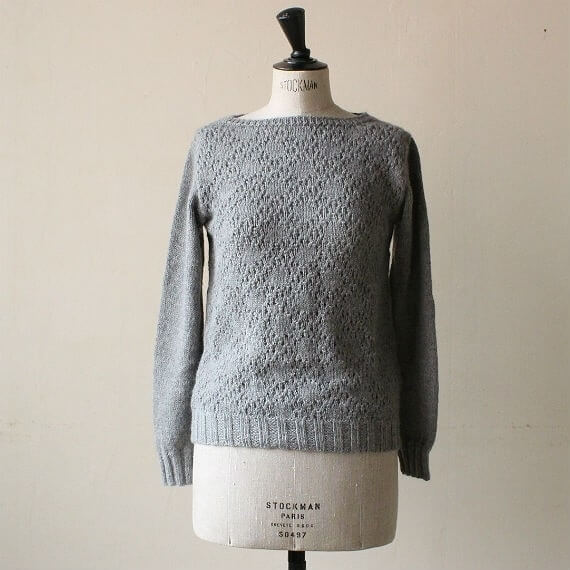 ムーリットのパターンブック「ALPACA糸に恋して」では、ラウヒアショール(2かせ使用)、フロントレースのセーター(5かせ使用)やヨークカーディガンの襟もとに使用しています。