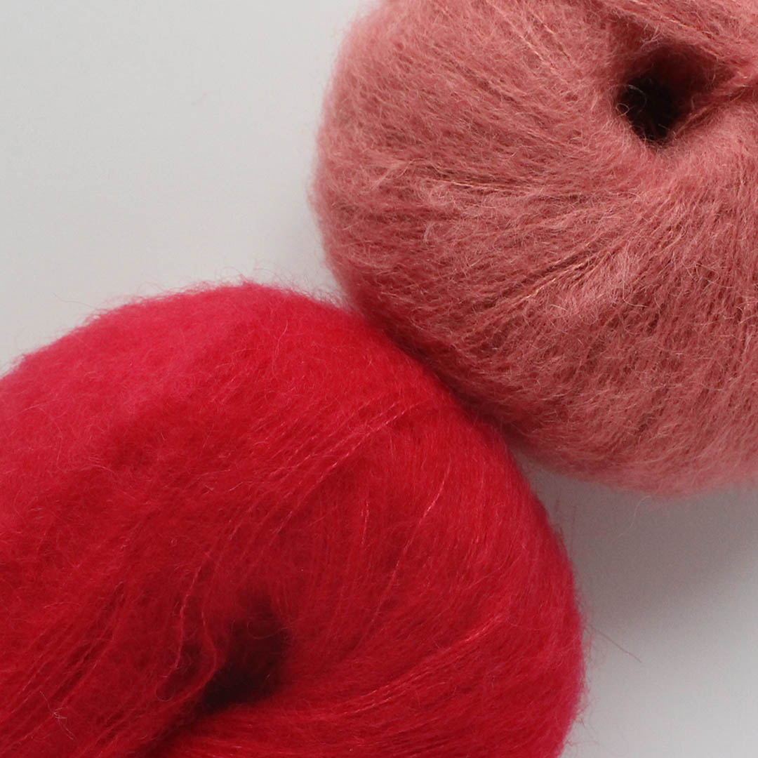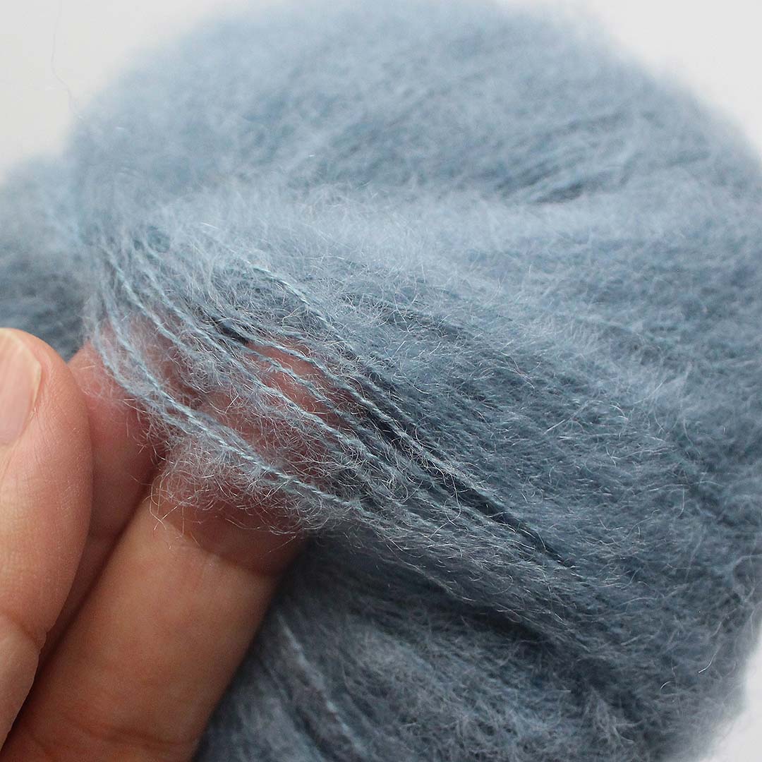 毛足が短めで、編み地は比較的コンパクトに仕上がりますが、アルパカがモヘアのこわさをやわらげて、モヘアのみに比べ全体によりふんわりとした印象です。引き揃えや編み込みでニュアンスを出すのにぴったりですし、2本どり、3本どりでローゲージに編むのもいいでしょう。