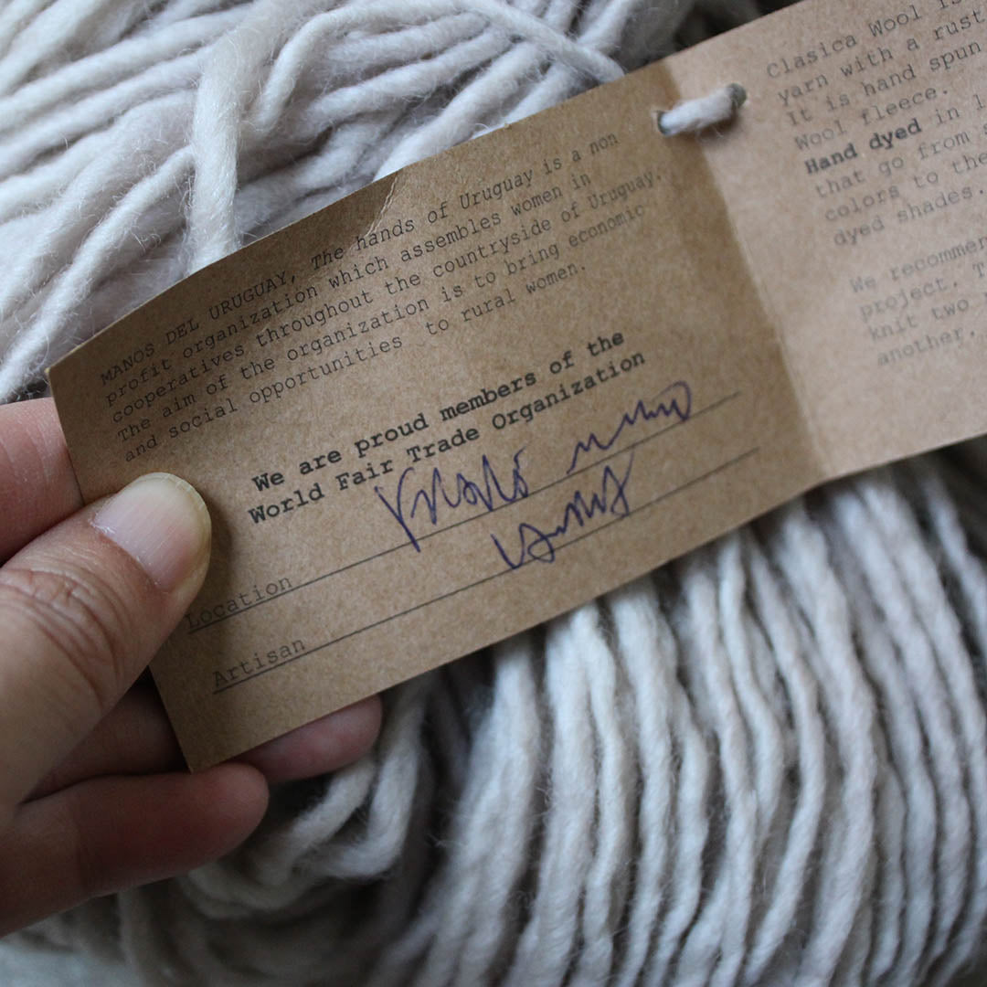 毛糸は一綛ずつ手で染められ、染めた村とその人のサインが手書きで入っています。編む側も特別な気持ちになる糸です。