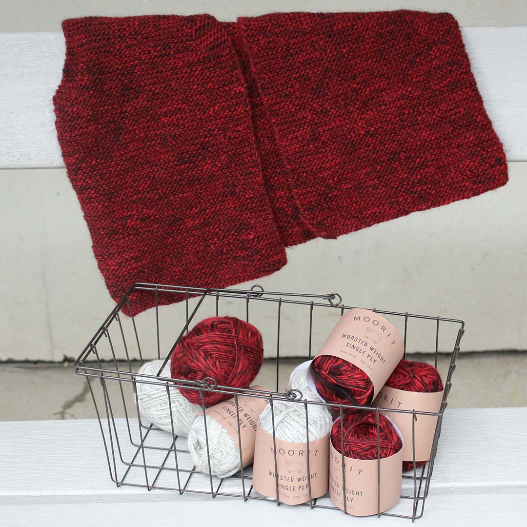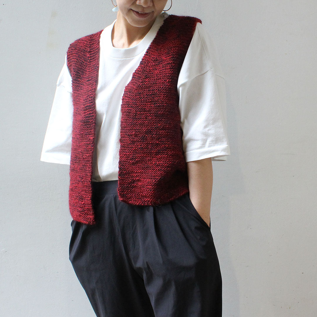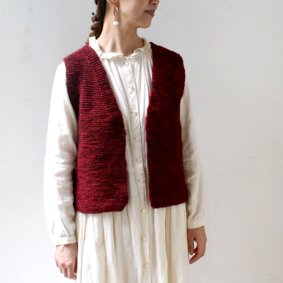 作品例の写真、ムーリットオリジナルデザイン「ガーター編みのジレ」キットでは7玉使用しました(4.2mm/JP7号針)。