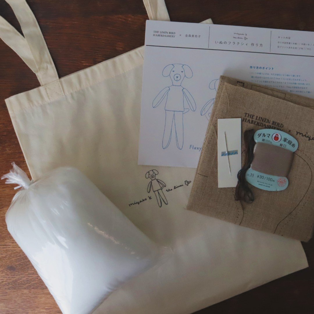 ぬいぐるみ作家 金森美也子さんによるお人形「いぬのフラクシィ」をつくるキットです。