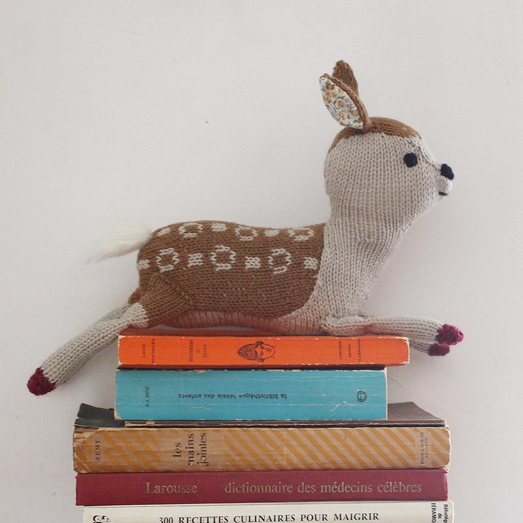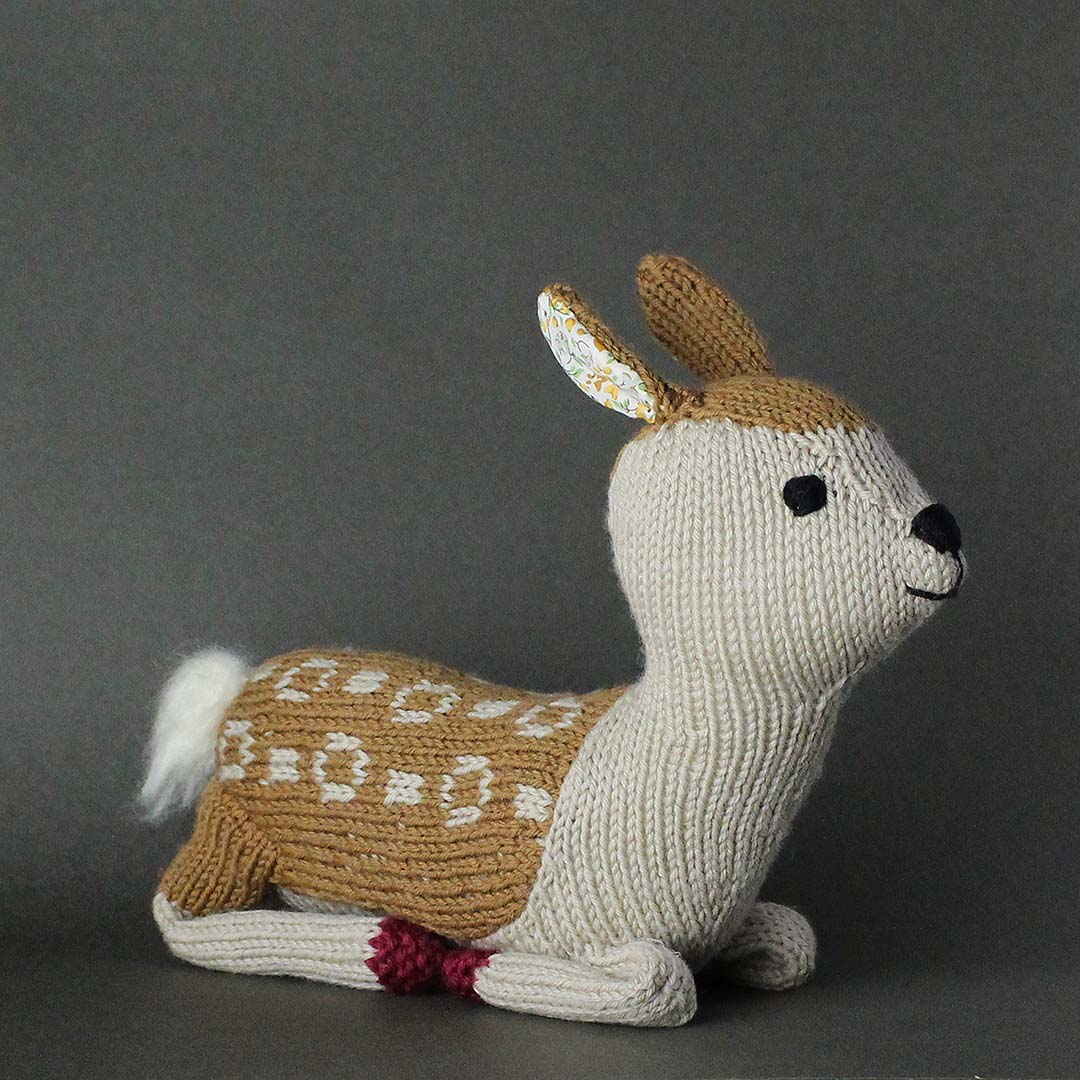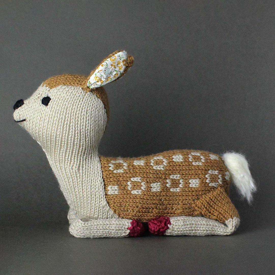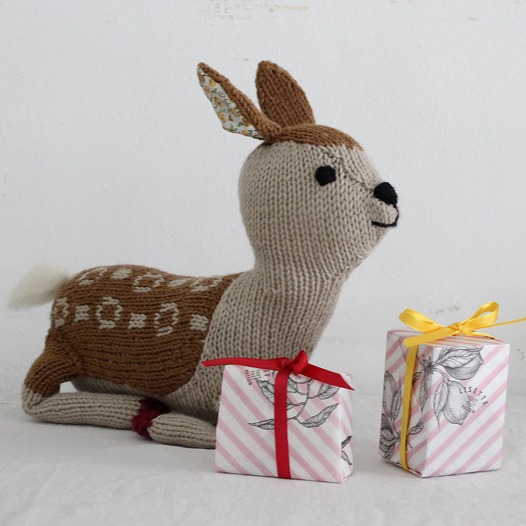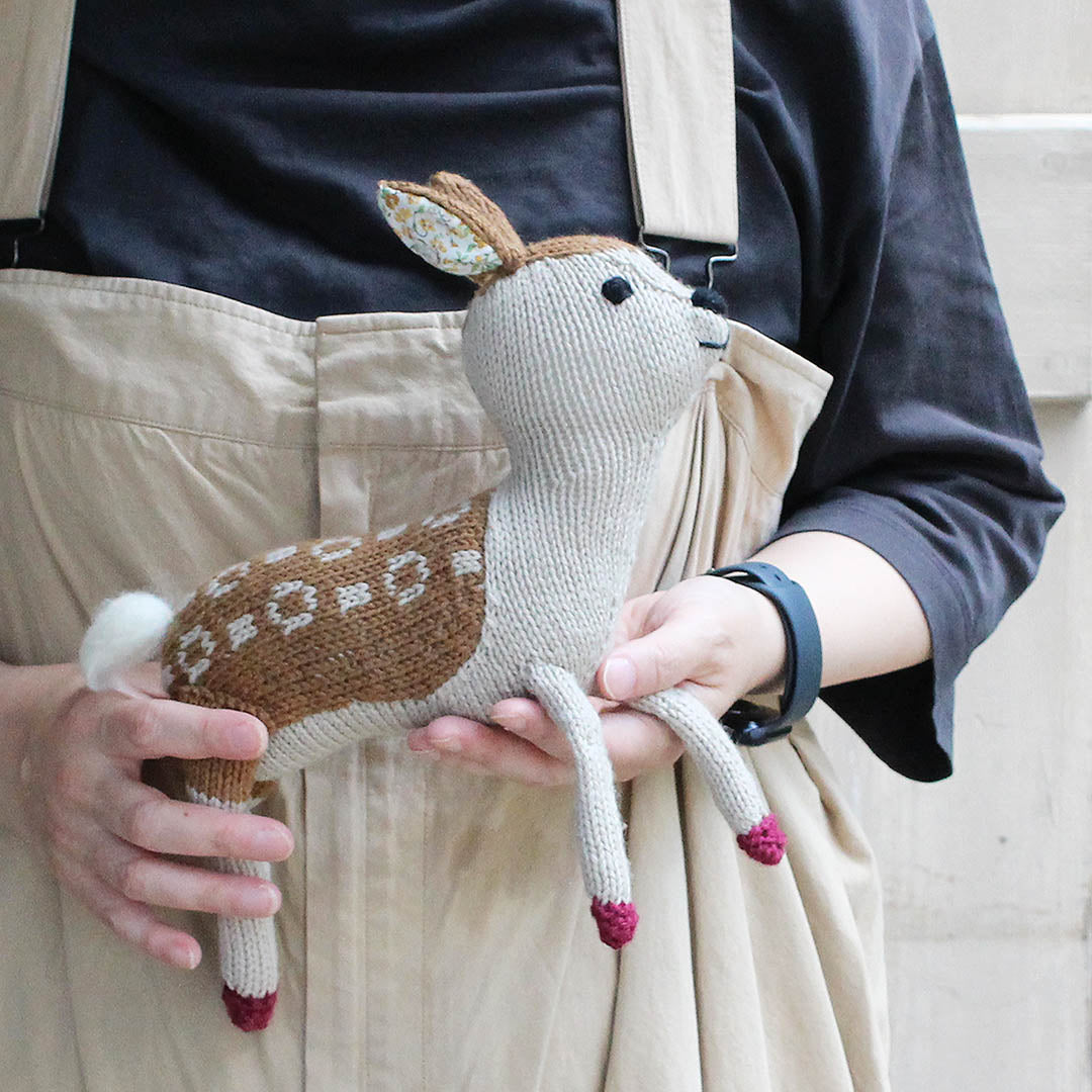 手編みならではの表現を最大限に活かしながら、制作工程にはあみぐるみ、ぬいぐるみ両方の技法を盛り込んで、金森さんデザインの愛らしい姿のこじかができるように工夫しています。